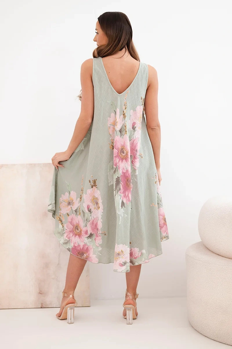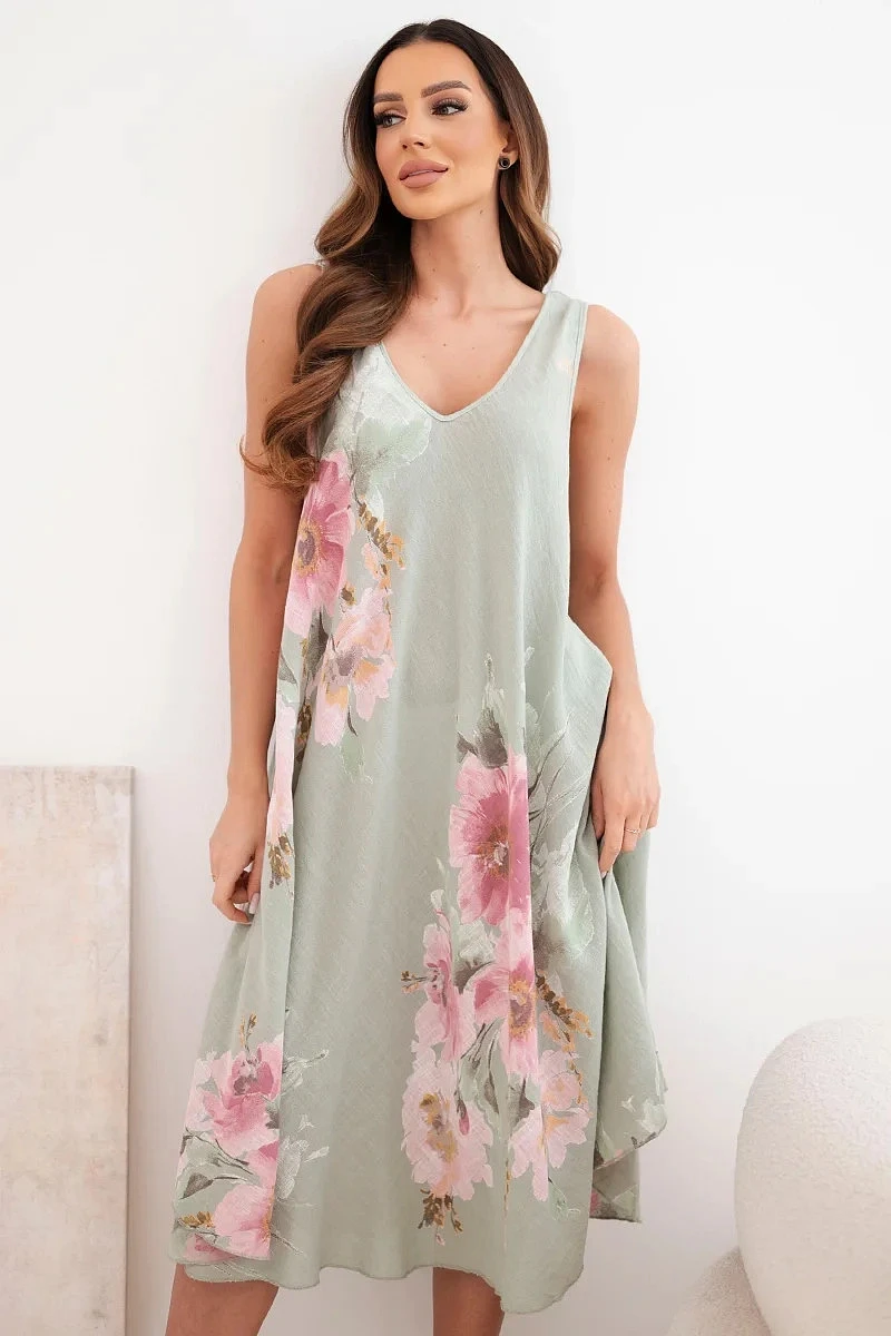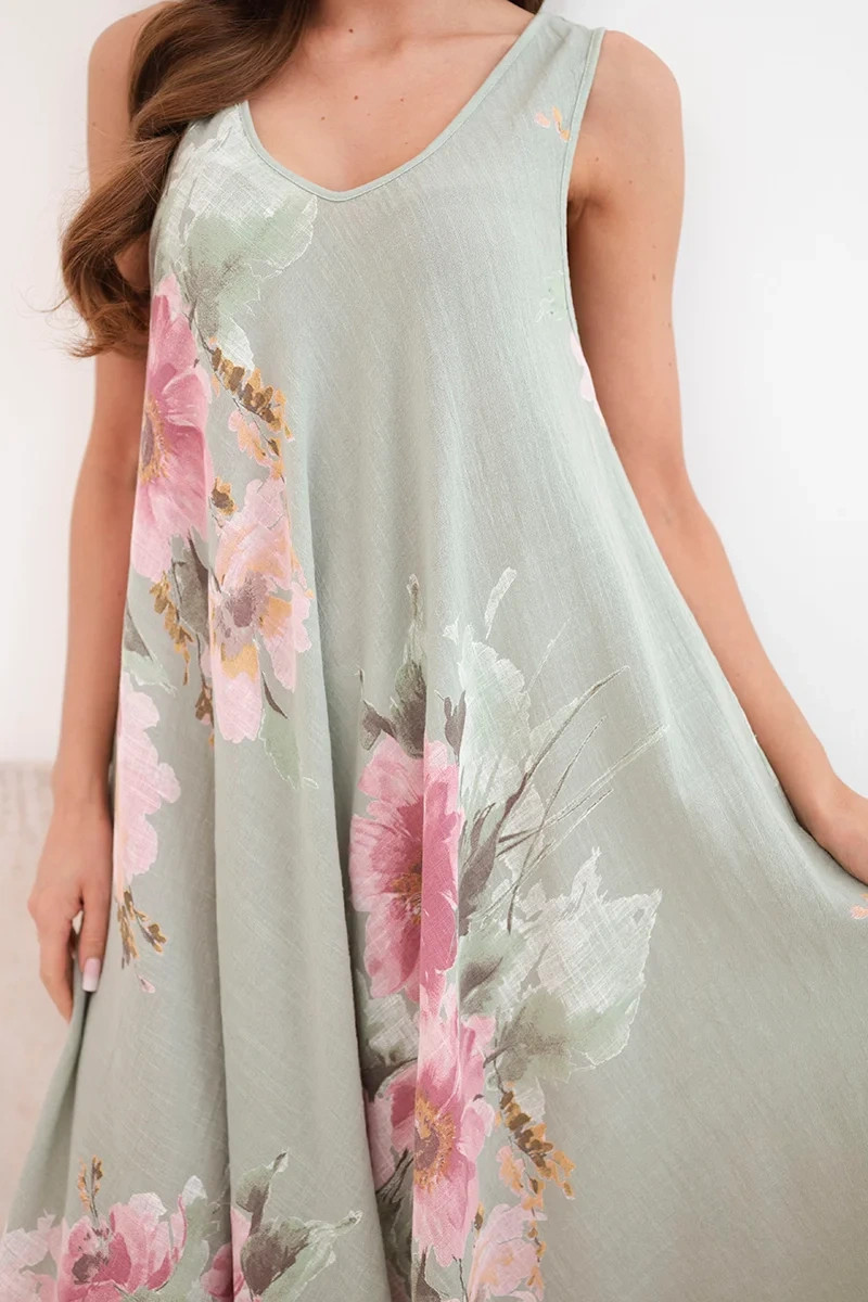 Model vyniká jemným výstřihem do tvaru V a efektním květinovým potiskem, který dodává celku romantický charakter. Je to vynikající volba pro ženy, které si cení módního vzhledu a pohodlí v jednom. Šaty se skvěle hodí jak k sandálům, tak k sportovní obuvi a vytvářejí stylizace pro různé příležitosti.