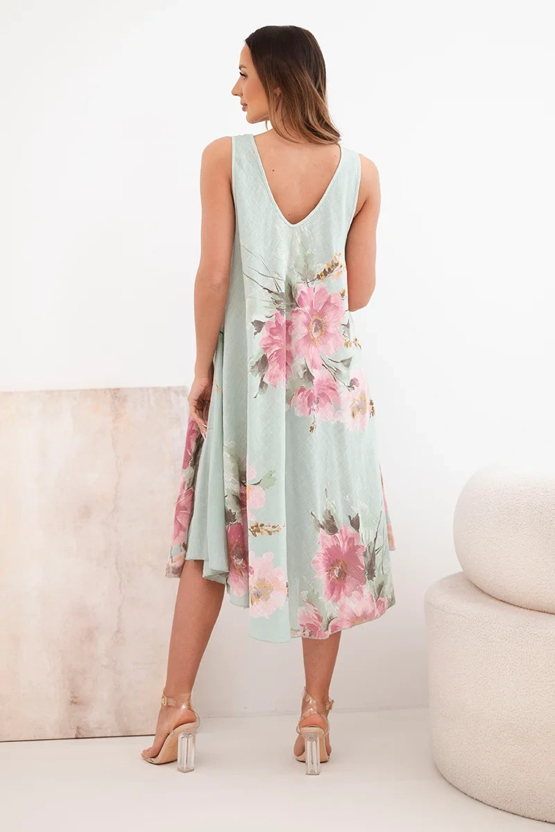 Dámské bavlněné oversize šaty s výstřihem do V a květinovým potiskem tmavě mátové