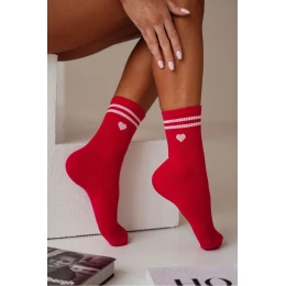 Roztomilé dámské bavlněné ponožky v červené barvě zdobené drobným srdíčkem a jemnými proužky. Jsou měkké, příjemné na dotek a díky své prodyšnosti vhodné pro celodenní nošení.
