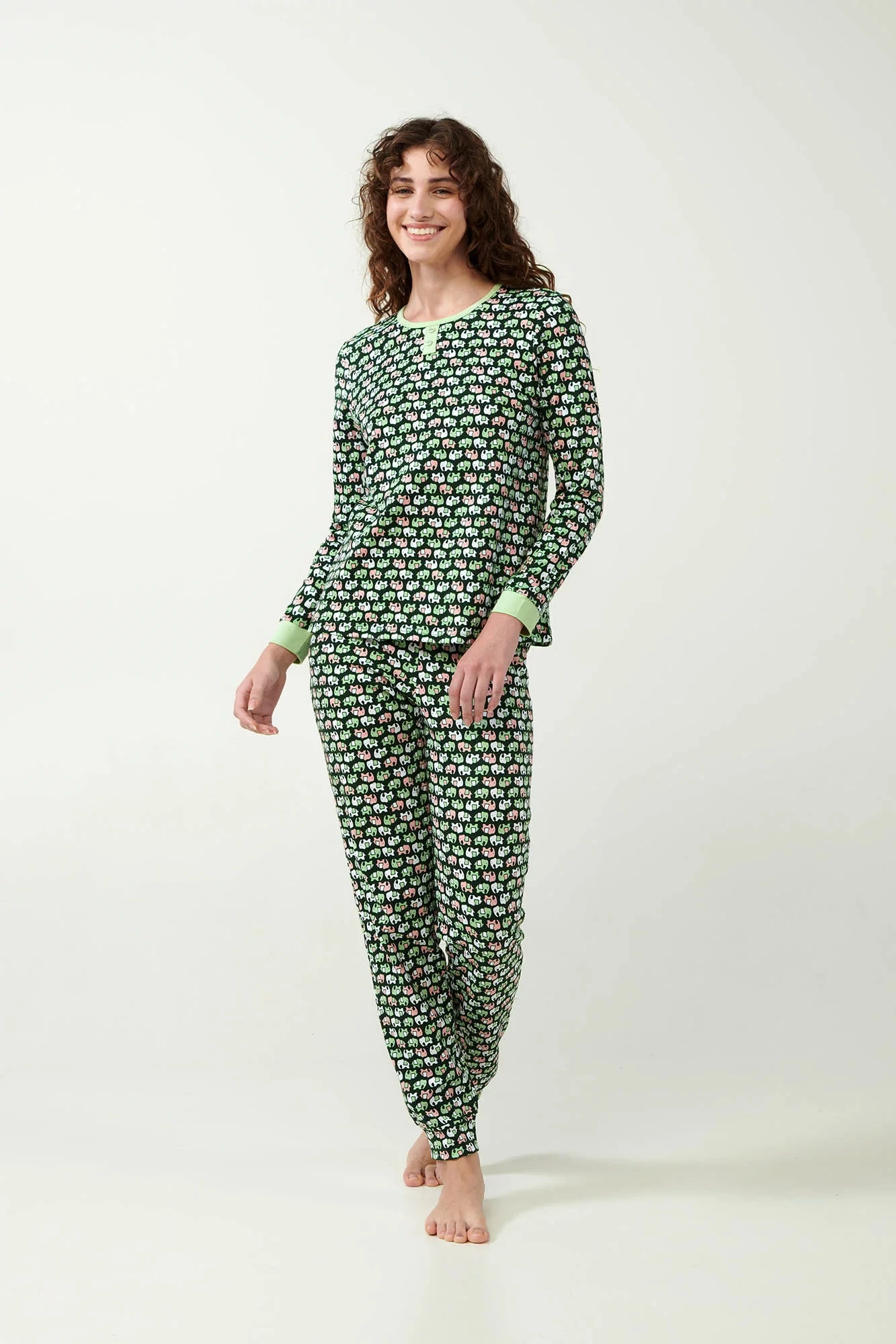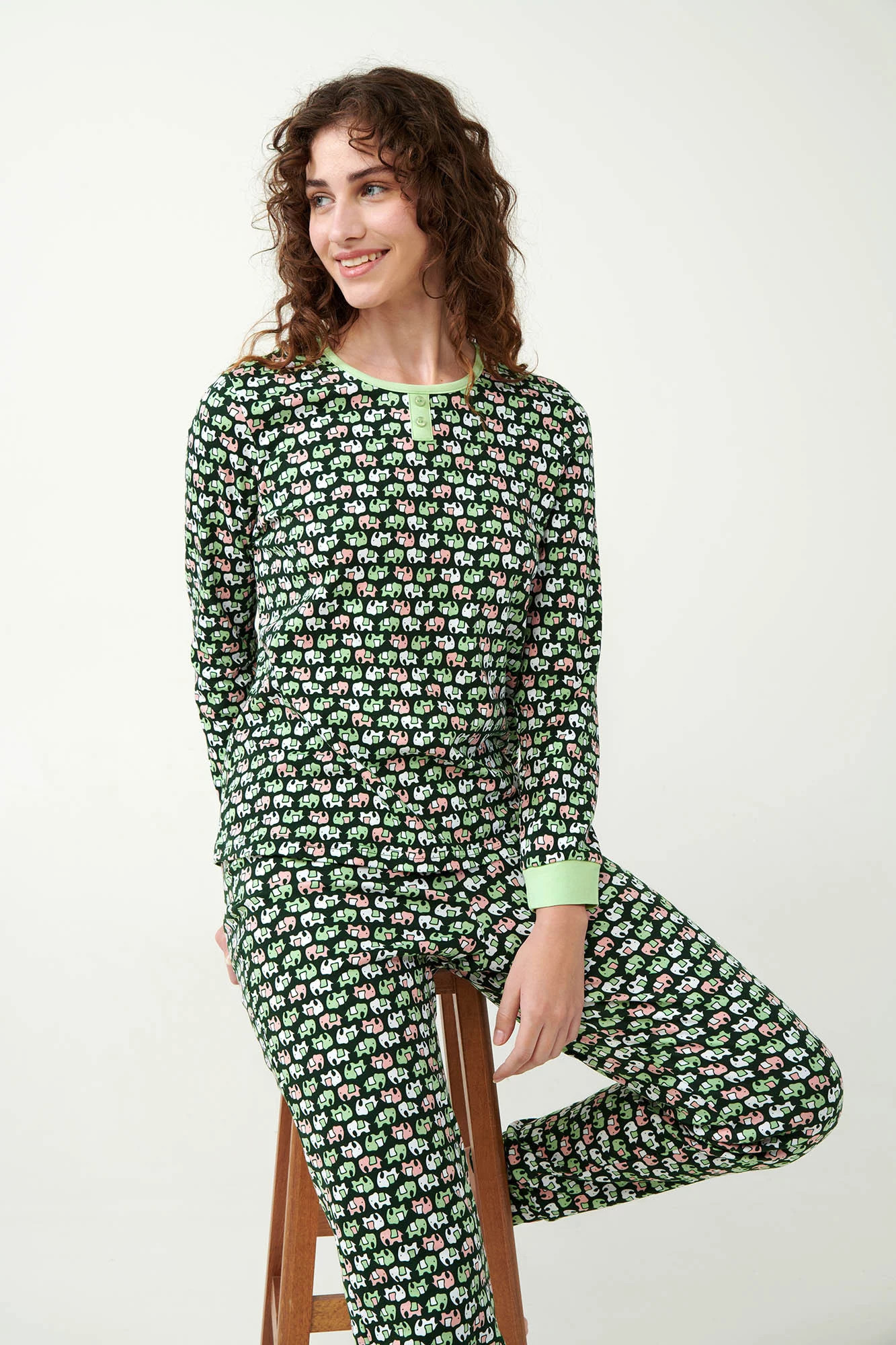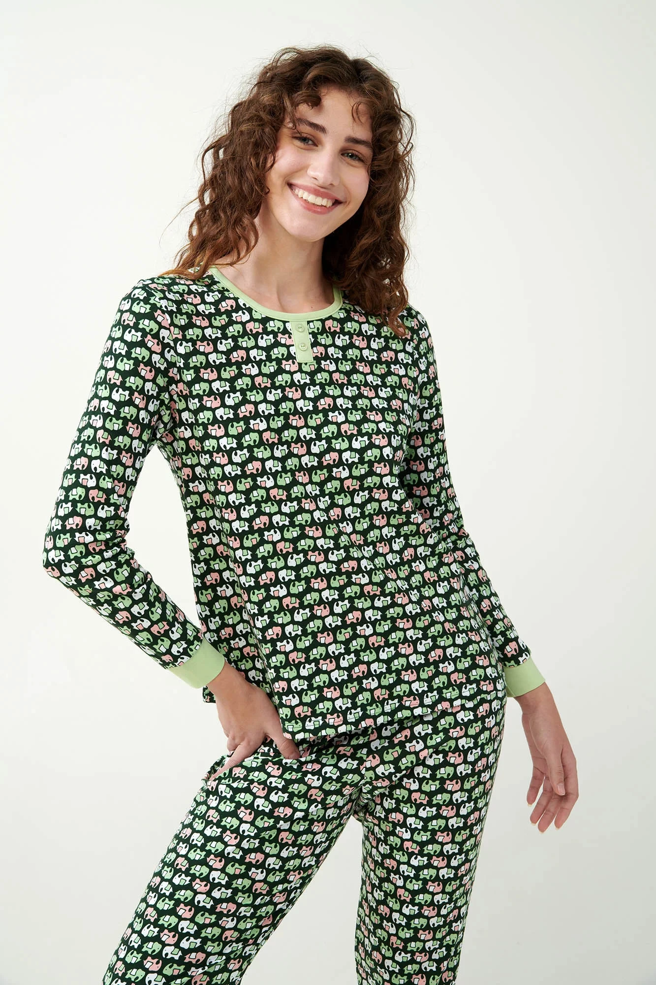 Vneste do svého spánku nádech exotiky s naším pyžamem s potiskem indických slonů. Toto pyžamo se zářivým vzorem slonů v sytém smaragdovém základu je vyrobeno ze 100% interlockové bavlny, která zajišťuje vynikající měkkost a odolnost. Sada obsahuje vrchní díl s kulatým výstřihem, rukávy s manžetami a odpovídající kalhoty s manžetami, které jsou navrženy v běžném střihu pro každodenní pohodlí. Toto pyžamo je ideální pro komfortní noci nebo pohodová rána a spojuje hravý styl s luxusním pohodlím.