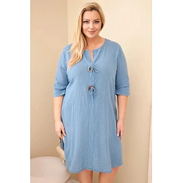Volný střih jemně padne na postavu, nepřiléhá těsně a zaručuje plnou volnost pohybu. Model má rukáv do lokte a výstřih do V s ozdobným zavázáním a dekorativními prvky, které celku dodávají originální charakter. Jsou to oversize dámské šaty, které skvěle zakryjí nedokonalosti a zvýrazní přednosti postavy.