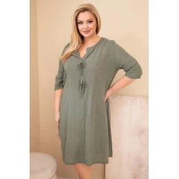 Volný střih jemně padne na postavu, nepřiléhá těsně a zaručuje plnou volnost pohybu. Model má rukáv do lokte a výstřih do V s ozdobným zavázáním a dekorativními prvky, které celku dodávají originální charakter. Jsou to oversize dámské šaty, které skvěle zakryjí nedokonalosti a zvýrazní přednosti postavy.