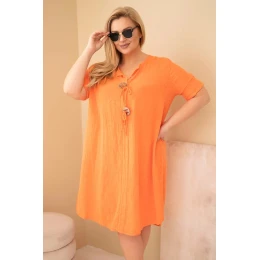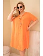 Volný střih jemně padne na postavu, nepřiléhá těsně a zaručuje plnou volnost pohybu. Model má rukáv do lokte a výstřih do V s ozdobným zavázáním a dekorativními prvky, které celku dodávají originální charakter. Jsou to oversize dámské šaty, které skvěle zakryjí nedokonalosti a zvýrazní přednosti postavy.