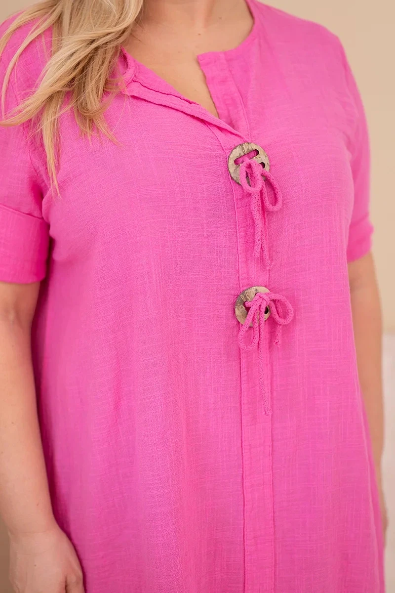 Volný střih jemně padne na postavu, nepřiléhá těsně a zaručuje plnou volnost pohybu. Model má rukáv do lokte a výstřih do V s ozdobným zavázáním a dekorativními prvky, které celku dodávají originální charakter. Jsou to oversize dámské šaty, které skvěle zakryjí nedokonalosti a zvýrazní přednosti postavy.