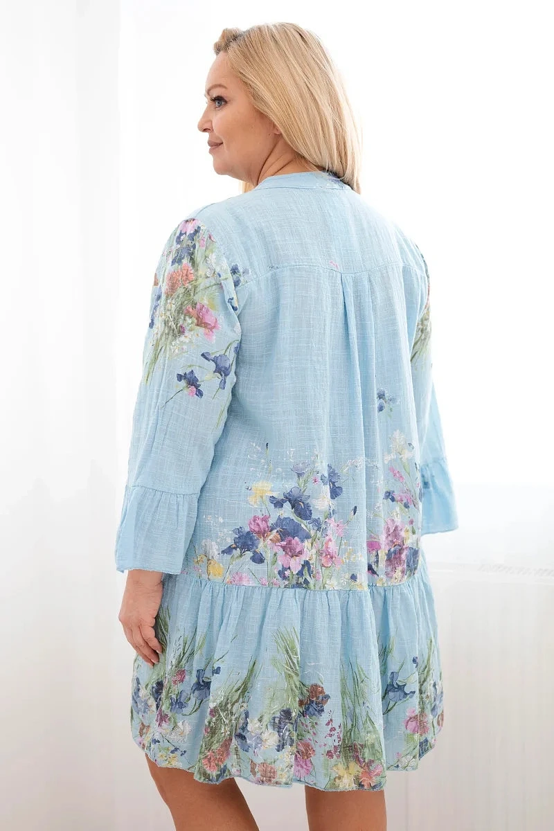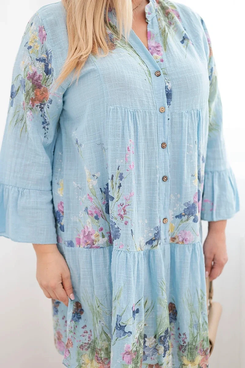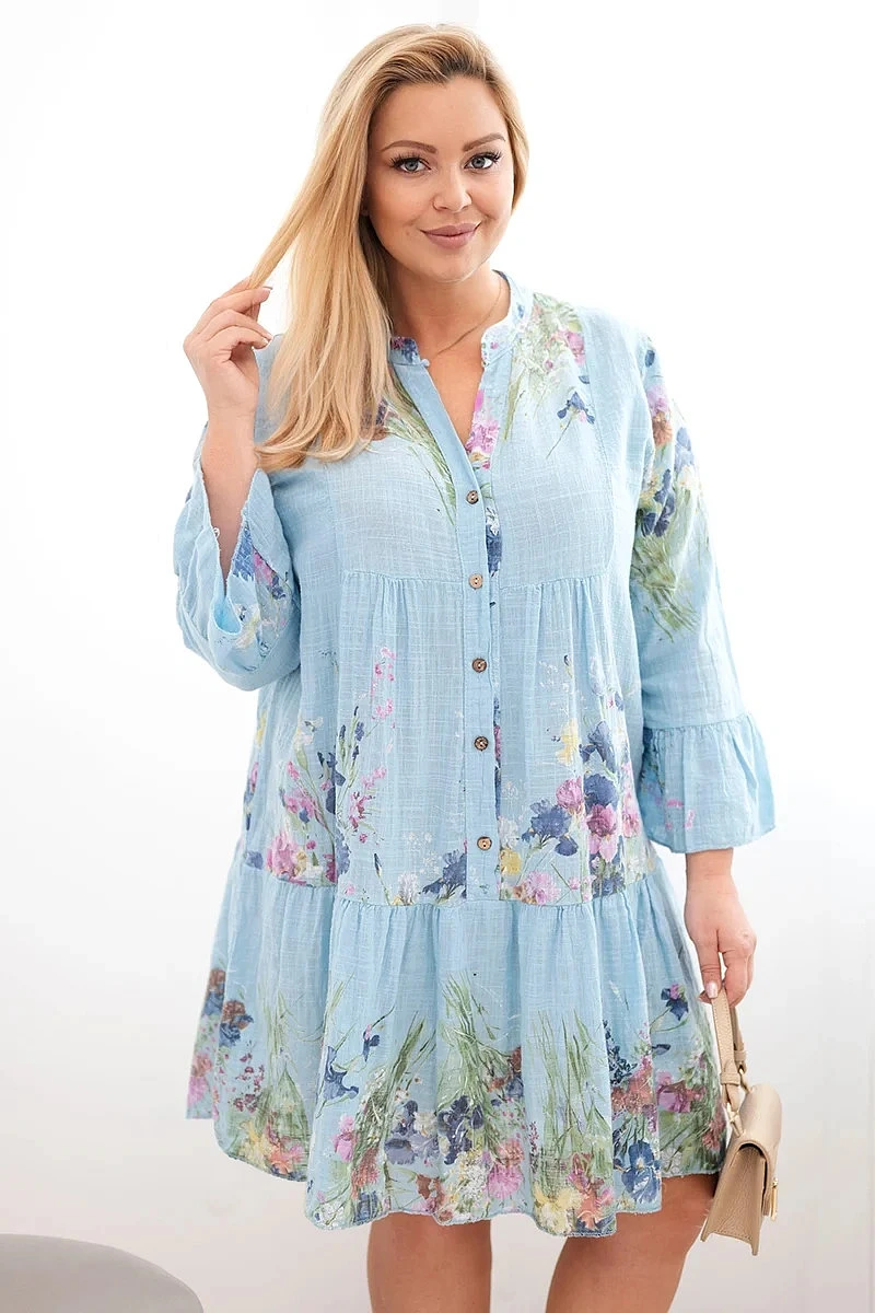 Lehké a velmi ženské dámské šaty vyrobené z přírodní bavlny jsou skvělou volbou na teplé dny. Model se vyznačuje krásným květinovým vzorem a volným, pohodlným střihem, který se hezky přizpůsobí postavě a zajišťuje volnost pohybu po celý den. Jemný výstřih do V a ozdobné knoflíky dodávají šatům jemnou eleganci a zdůrazňují jejich výjimečný charakter.