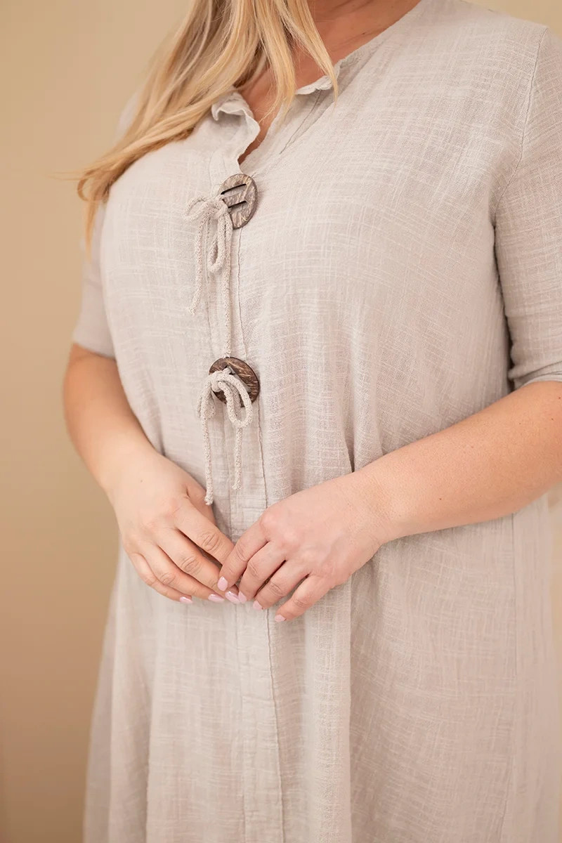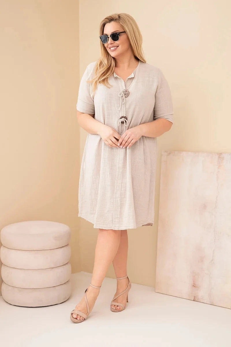 Volný střih jemně padne na postavu, nepřiléhá těsně a zaručuje plnou volnost pohybu. Model má rukáv do lokte a výstřih do V s ozdobným zavázáním a dekorativními prvky, které celku dodávají originální charakter. Jsou to oversize dámské šaty, které skvěle zakryjí nedokonalosti a zvýrazní přednosti postavy.