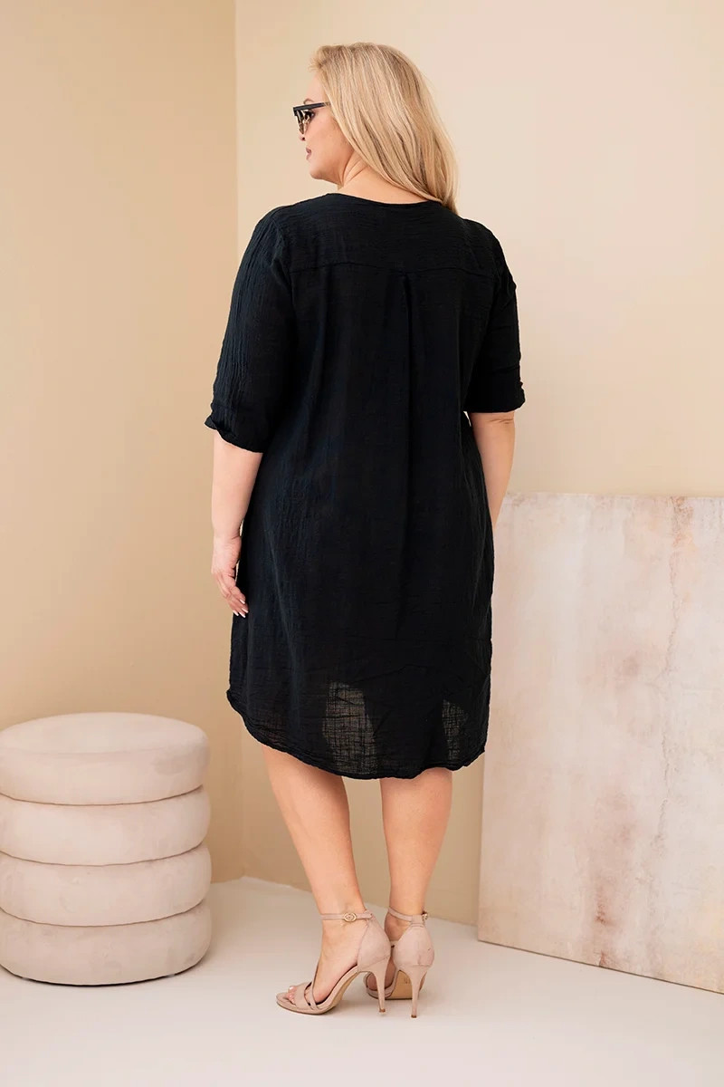 Dámské šaty plus size jsou vynikající nabídkou pro ženy, které si cení pohodlí, volnosti a přírodních materiálů. Vyrobené ze 100% bavlny zajišťují prodyšnost a komfort při nošení i v teplejších dnech. Lehký, prodyšný materiál činí šaty ideální volbou do jarně-letního období, jak na běžné nošení, tak na dovolené.