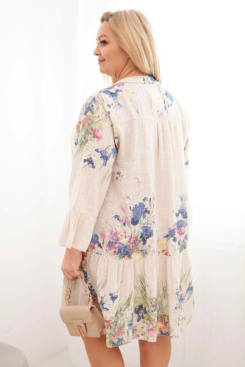 • Dámské bavlněné šaty ve velikosti Plus Size s výstřihem do V a knoflíky s květinovým vzorem béžová