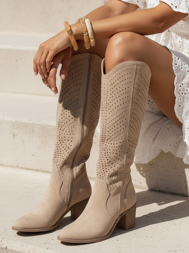 Kozaki wykonane z zamszu ekologicznego z perforowaną cholewką na całej długości. Ażurowa struktura wspiera przewiewność i nadaje lekkości wizualnej. Stabilny obcas podkreśla sylwetkę, zachowując komfort podczas chodzenia. Zapięcie na suwak ułatwia szybkie zakładanie.