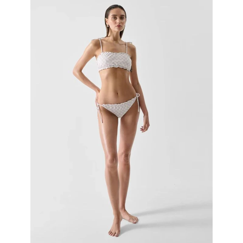 Spodní díl ve střihu bikin je nezbytným doplňkem pro léto! Tento model je vyroben z vysoce kvalitní syntetické tkaniny s jedinečným vaflovým vzorem a poskytuje pohodlí i elegantní vzhled. Okraje zdobí obruče, které nabízejí lesklý povrch. Díky zavazování na bocích lze spodní díl dokonale přizpůsobit postavě, což zaručuje pohodlí a volnost. Hladká podšívka navíc zvyšuje pohodlí nositelky a materiál s vaflovou strukturou je příjemný na dotek.