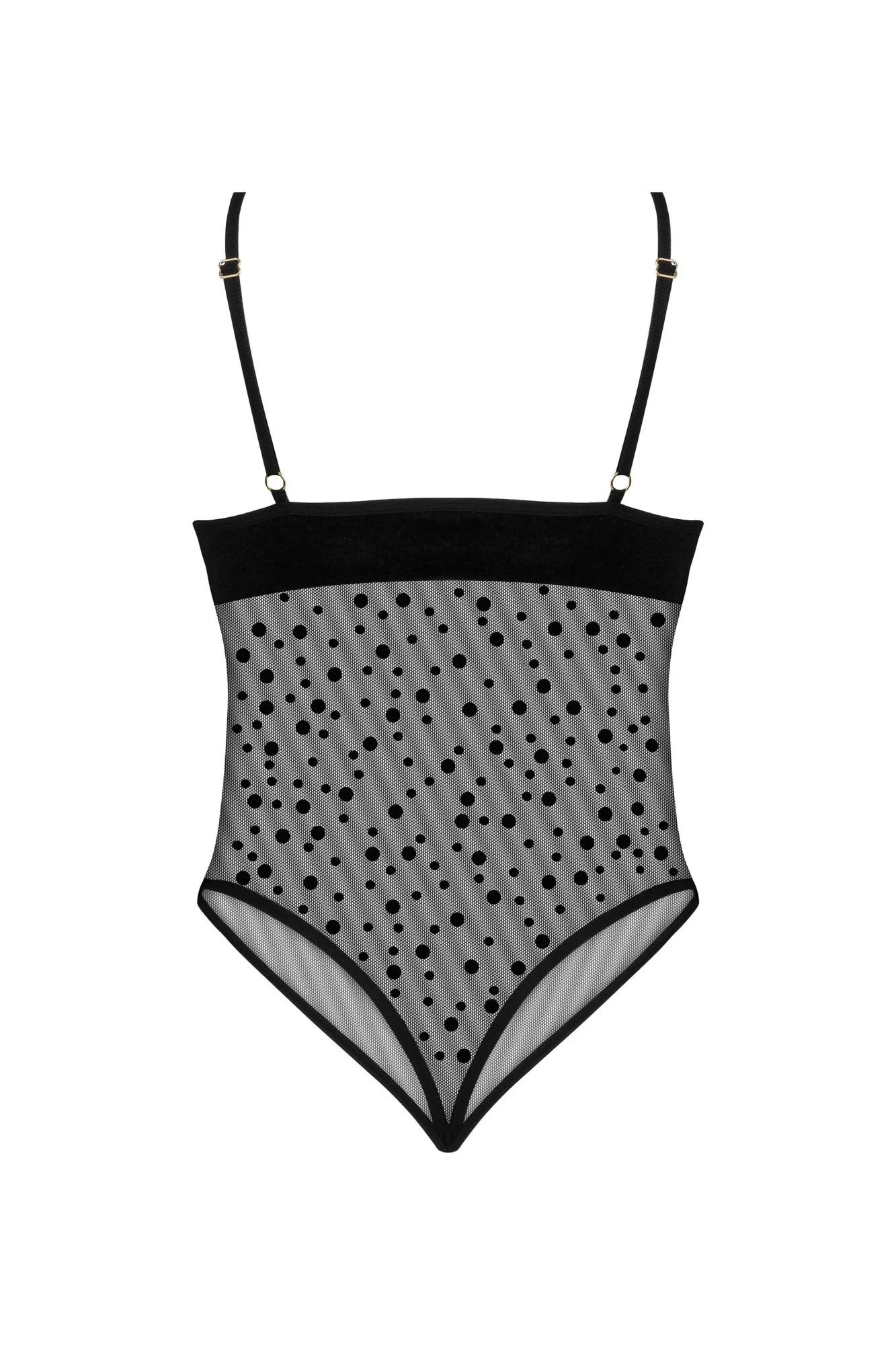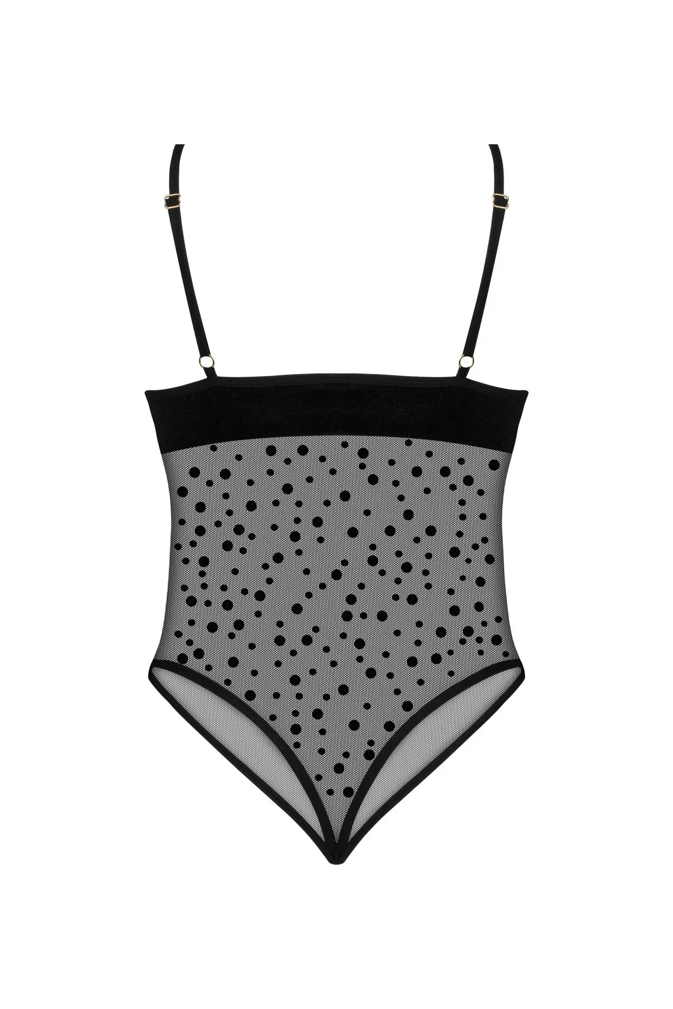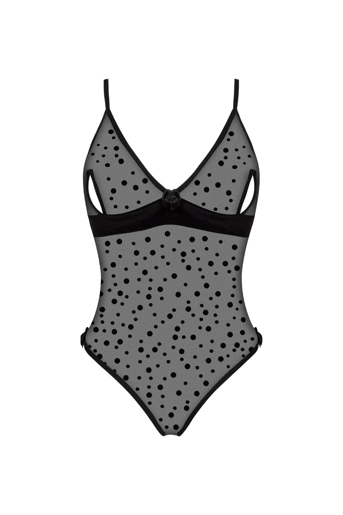 Dámské erotické body Amalia teddy BEAUTY NIGHT FASHION - černá barva - z průhledné síťoviny zdobenou puntíky - sexy výstřihy kolem poprsí - zdobené mašličkami - zapínání v rozkroku