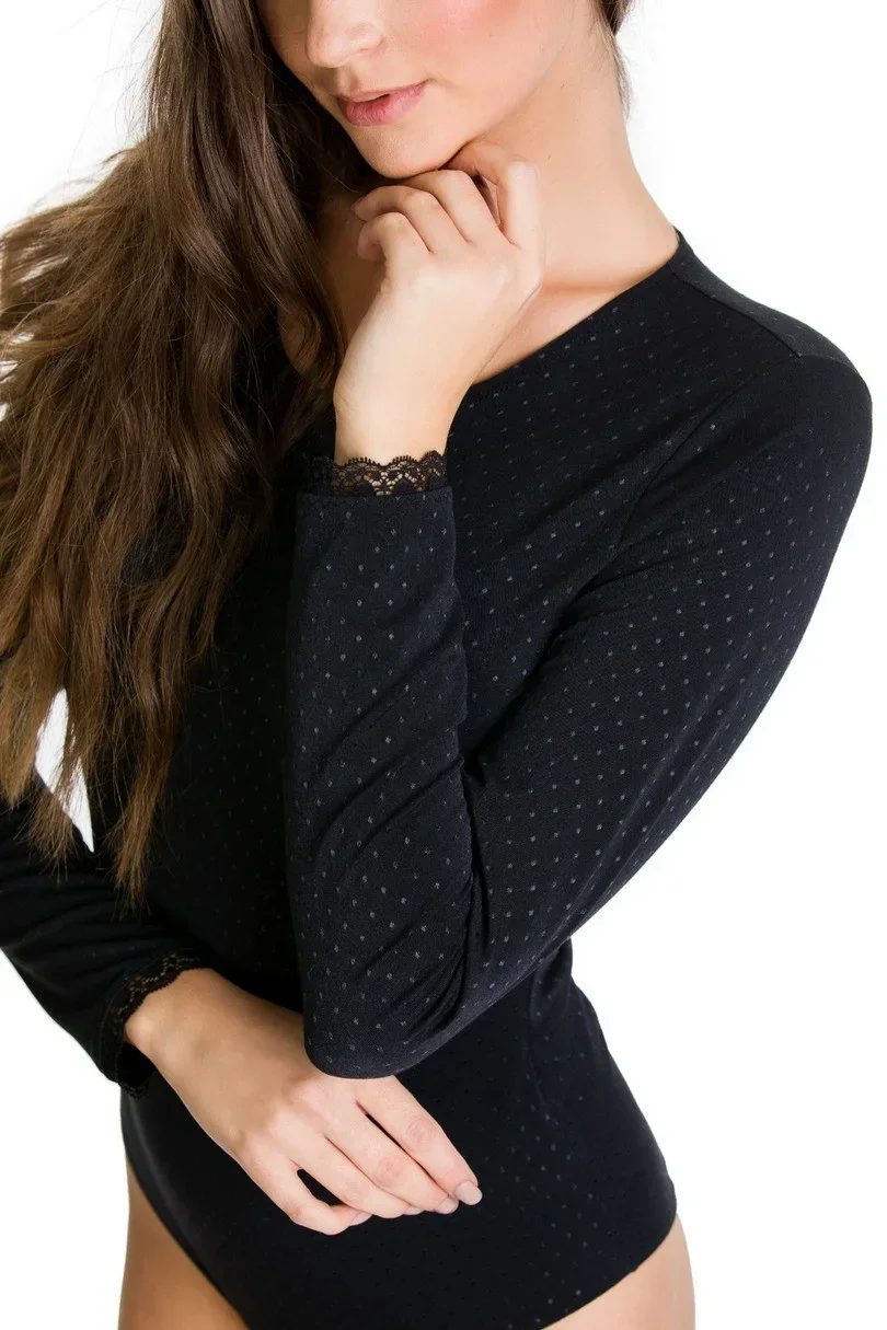 Dámské body s dlouhými rukávy olemovanými krajkou.