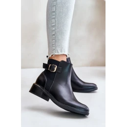 Dámské boty vyrobené z eko kůže. Usazeny na nízkém podpatku. Špičky zaoblené. Zapínání na zip. Uvnitř zateplené obuvnickou vlnou. Tento model se vyznačuje páskem se zlatou sponou. Klasický střih umožňuje jejich kombinaci s mnoha styly. Určitě byste je měla mít ve svém podzimním šatníku! Při výběru velikosti se řiďte tabulkou velikostí.