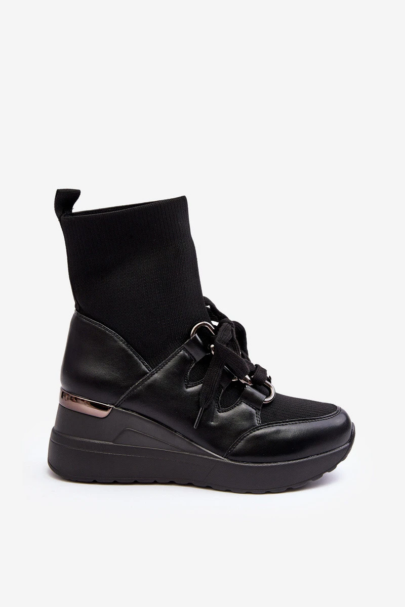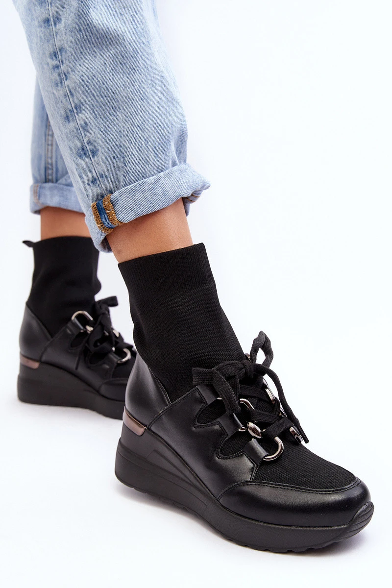 Boty dámské ve sportovním stylu vyrobené z kombinace ekologické kůže a textilního materiálu. Osazené na klínku. Šos s tvarovanou ponožkou. Model s vloženým šněrováním. Špička zaoblená. Patka zesílená. Měkká, ekologická kožená vložka zajistí pohodlí při používání. Při výběru velikosti se řiďte tabulkou velikostí.