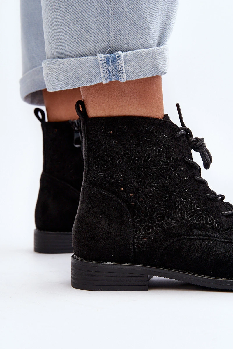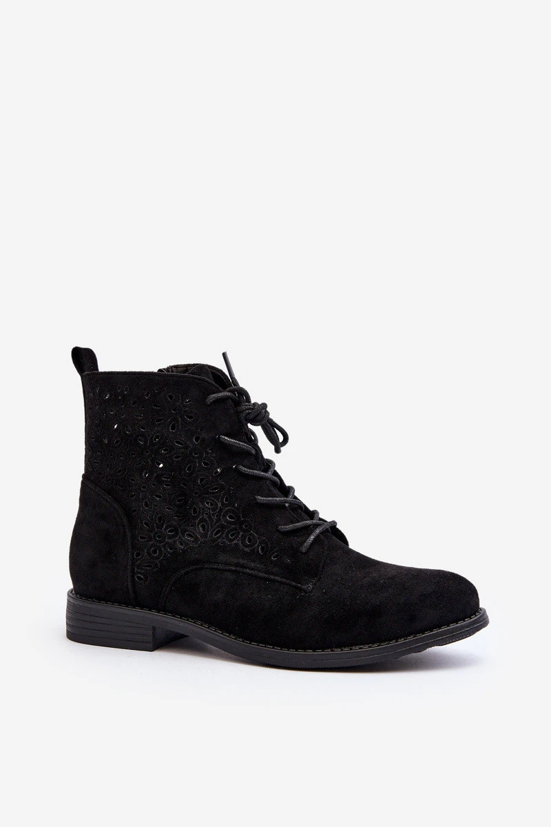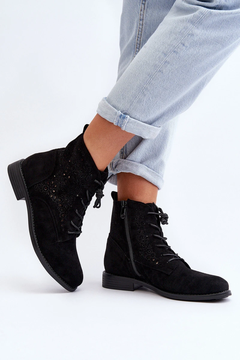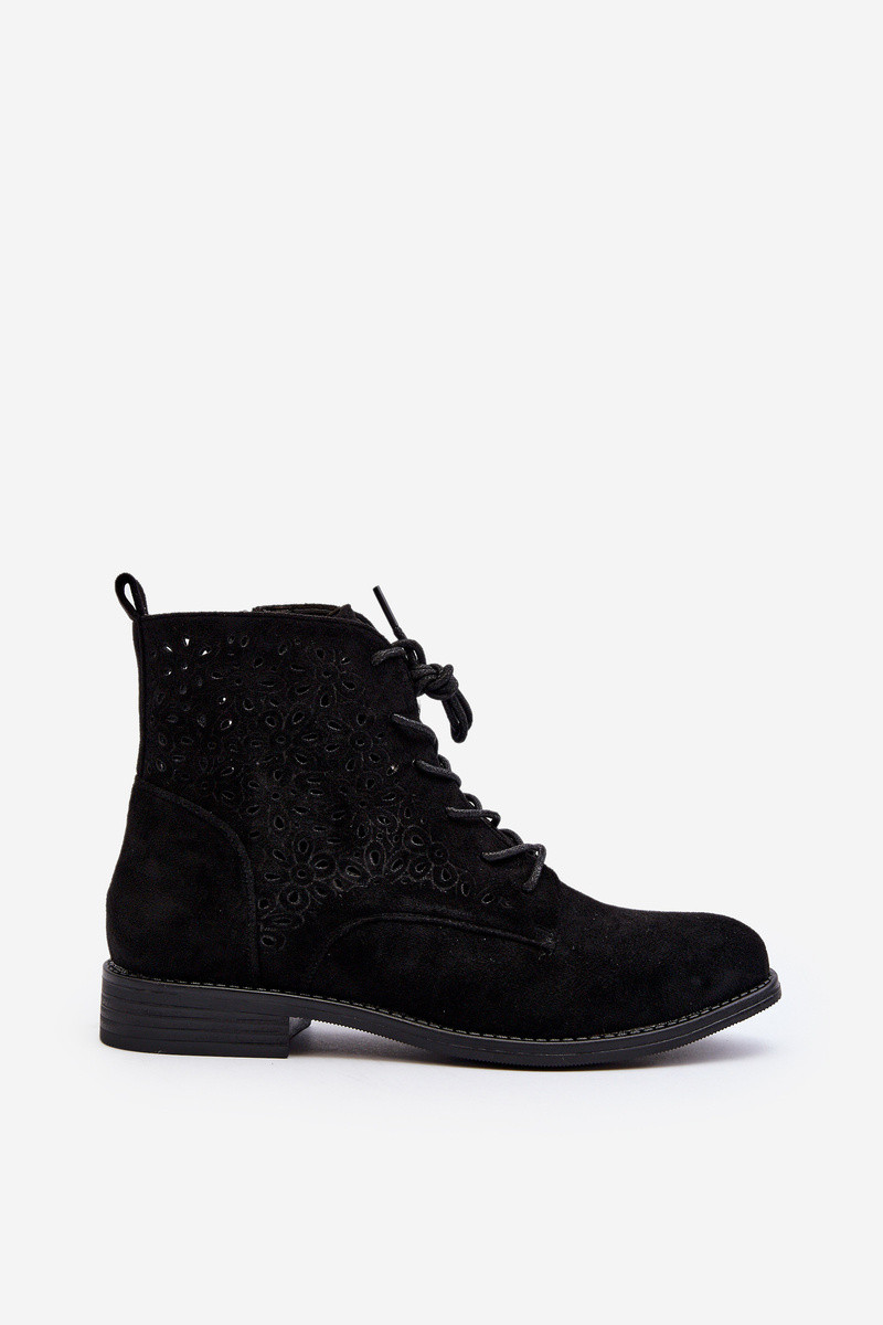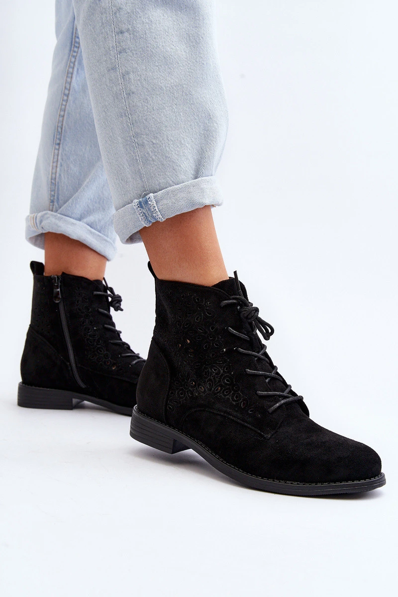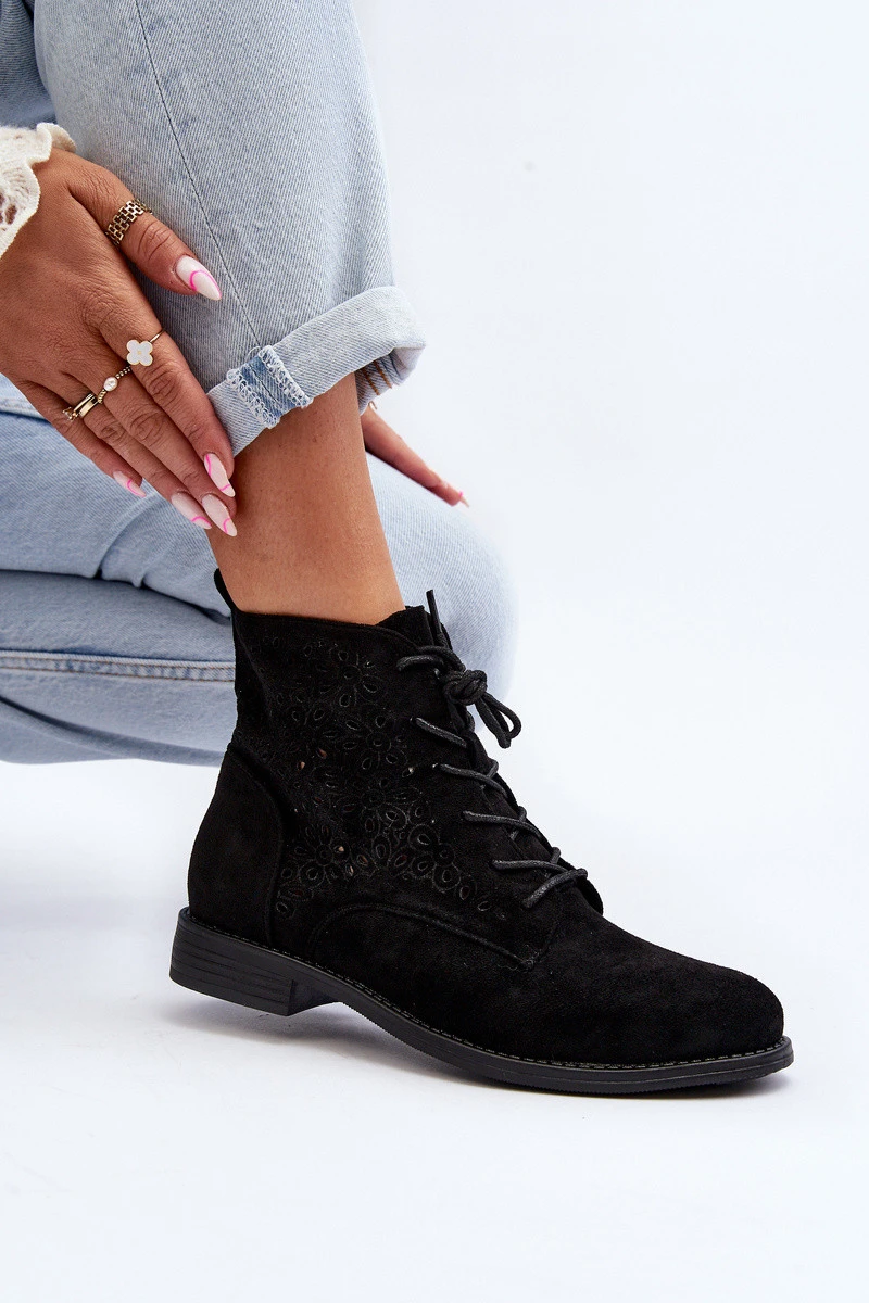 Dámské boty vyrobené z ekologického semiše. Vykrajovaný svršek zdobený květinami. Umístěné na plochém podpatku. Zapínání na zip z boku a navíc mají šněrování, což umožní lepší přizpůsobení. Zaoblené špičky. Tento model navíc disponuje zesílenou patou. Určitě si také prohlédněte další modely botů dostupné v naší nabídce! Při výběru velikosti se řiďte tabulkou velikostí.