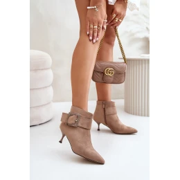 Stylové boty na podpatku. Vyrobeno z eko semiše. Zapínání na zip zajišťuje pohodlí a snadné oblékání. Špičaté špičky dodávají rafinovaný charakter, zdůrazňují ženskost a štíhlost siluety. Hlavním přínosem tohoto modelu je velká, ozdobná spona na straně holeně. Ideální na zvláštní příležitosti i pro každodenní styling! Při výběru velikosti se řiďte tabulkou velikostí.