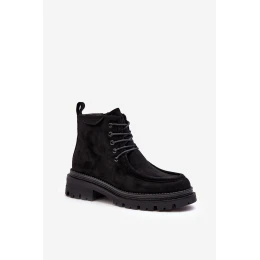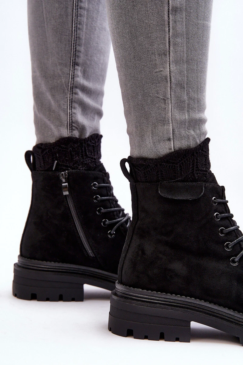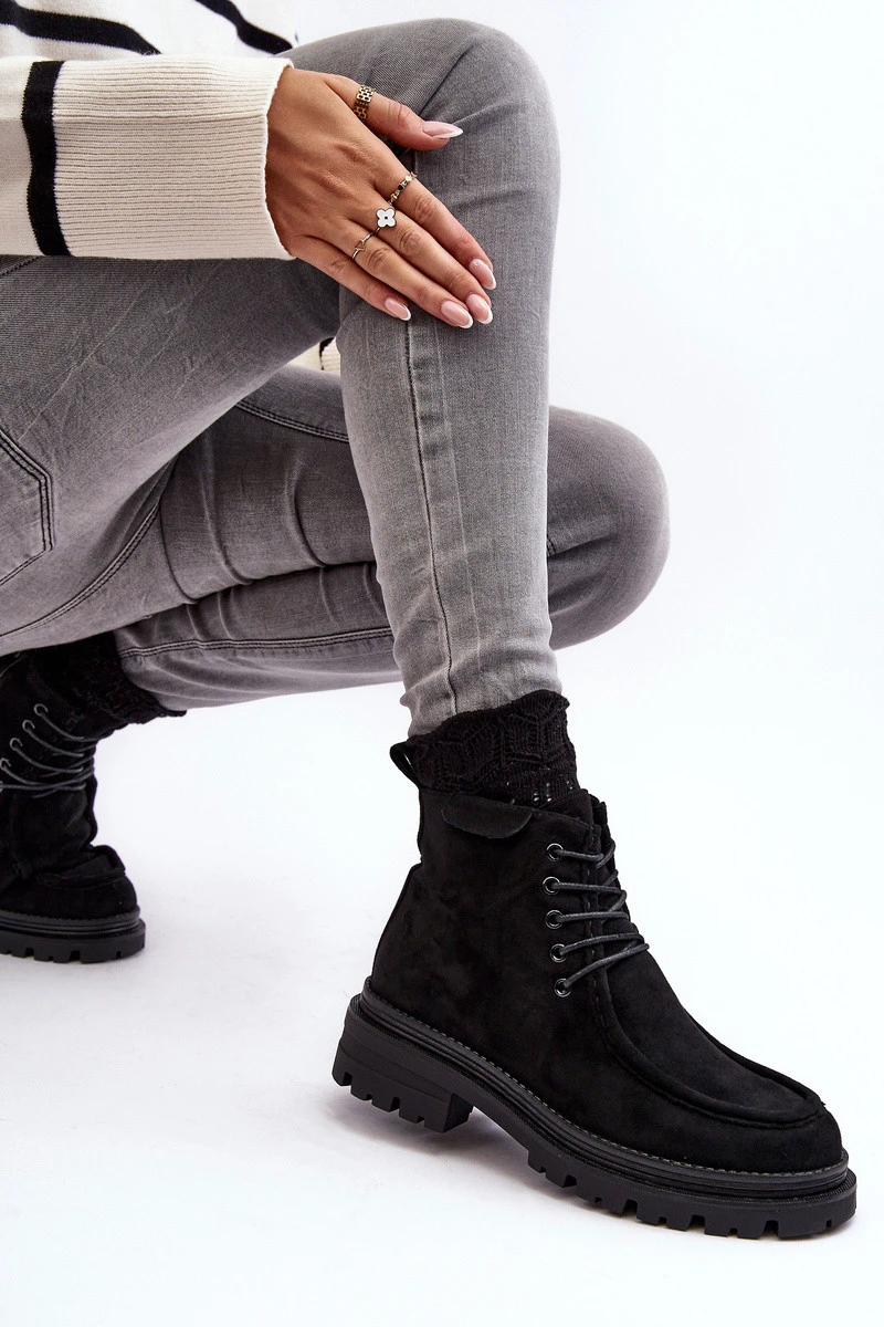 Dámské boty vyrobené z eko semiše. Zip na boku. Vnitřní podšívka z obuvnického polštáře. Plochá podpatek a platforma poskytuje stabilitu na každém kroku. Přední šněrování. Rouno špička. Boty jsou ideální na zimní dny! Při výběru velikosti se řiďte tabulkou velikostí.