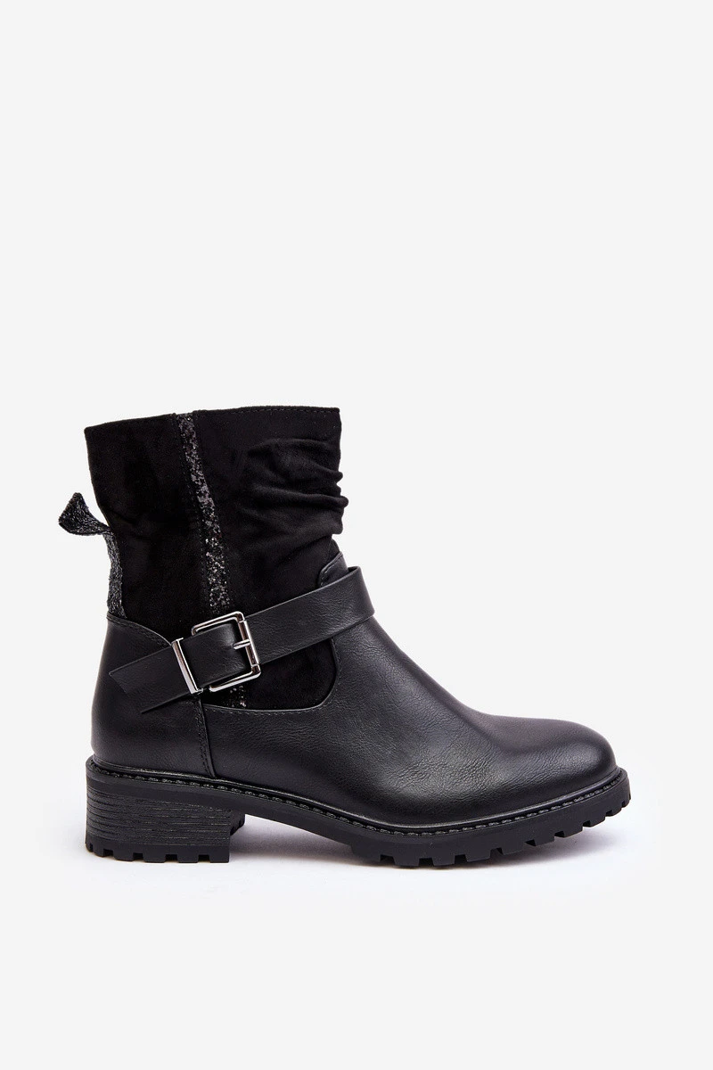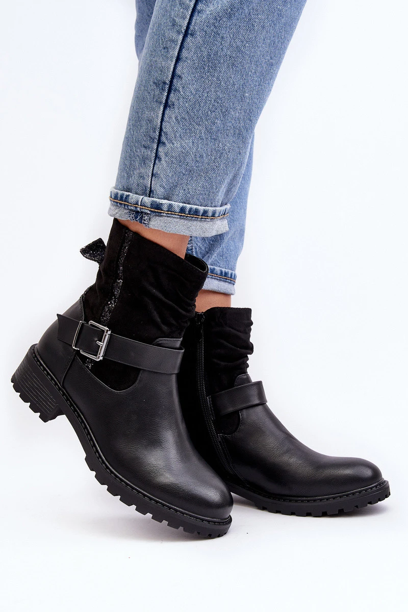 Boty dámské s manžetou s kotníkem. Vyrobeno z kombinace ekologické kůže a eko semišu. Osazené na plochém, stabilním podpatku. Špička zaoblená. Špička zesílená. Upevněno na zip. Manžeta ozdobena malými kamínky a páskem s klipsou. Vyhřívané syntetickou výplní uvnitř. Určitě byste měli tento model mít ve svém šatníku! Při výběru velikosti se řiďte tabulkou velikostí.