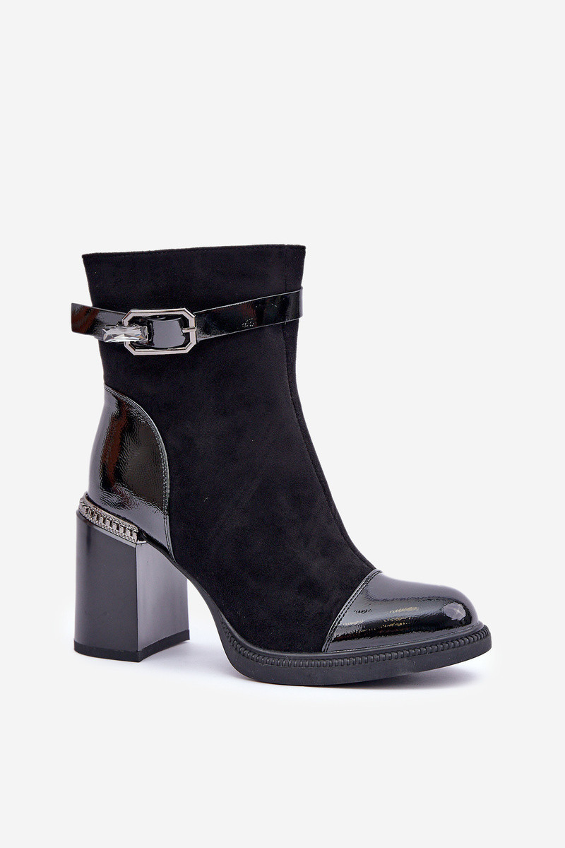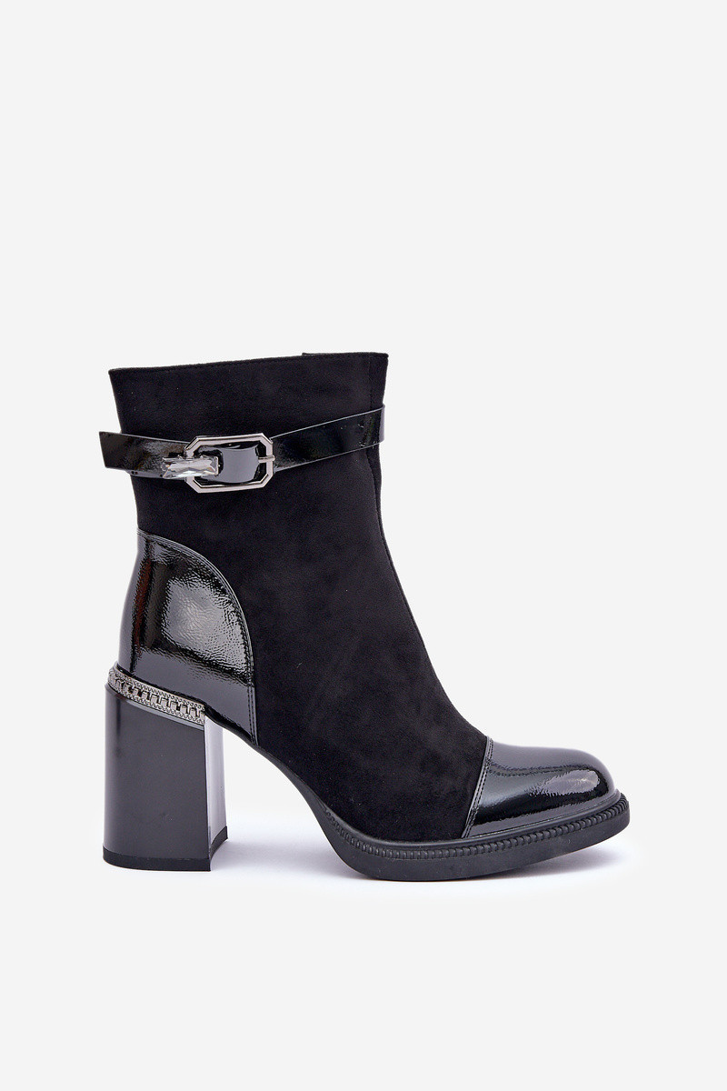 Elegantní boty vyrobené z eko kůže. Tento model se vyznačuje ozdobným prvkem u podpatku a sponou, která dodává eleganci. Interiér je zateplen pro další komfort v chladnějších dnech. Model se zapíná na zip, s mandlemi na špičkách. Ideální pro mnoho stylizací! Při výběru velikosti se řiďte tabulkou velikostí.
