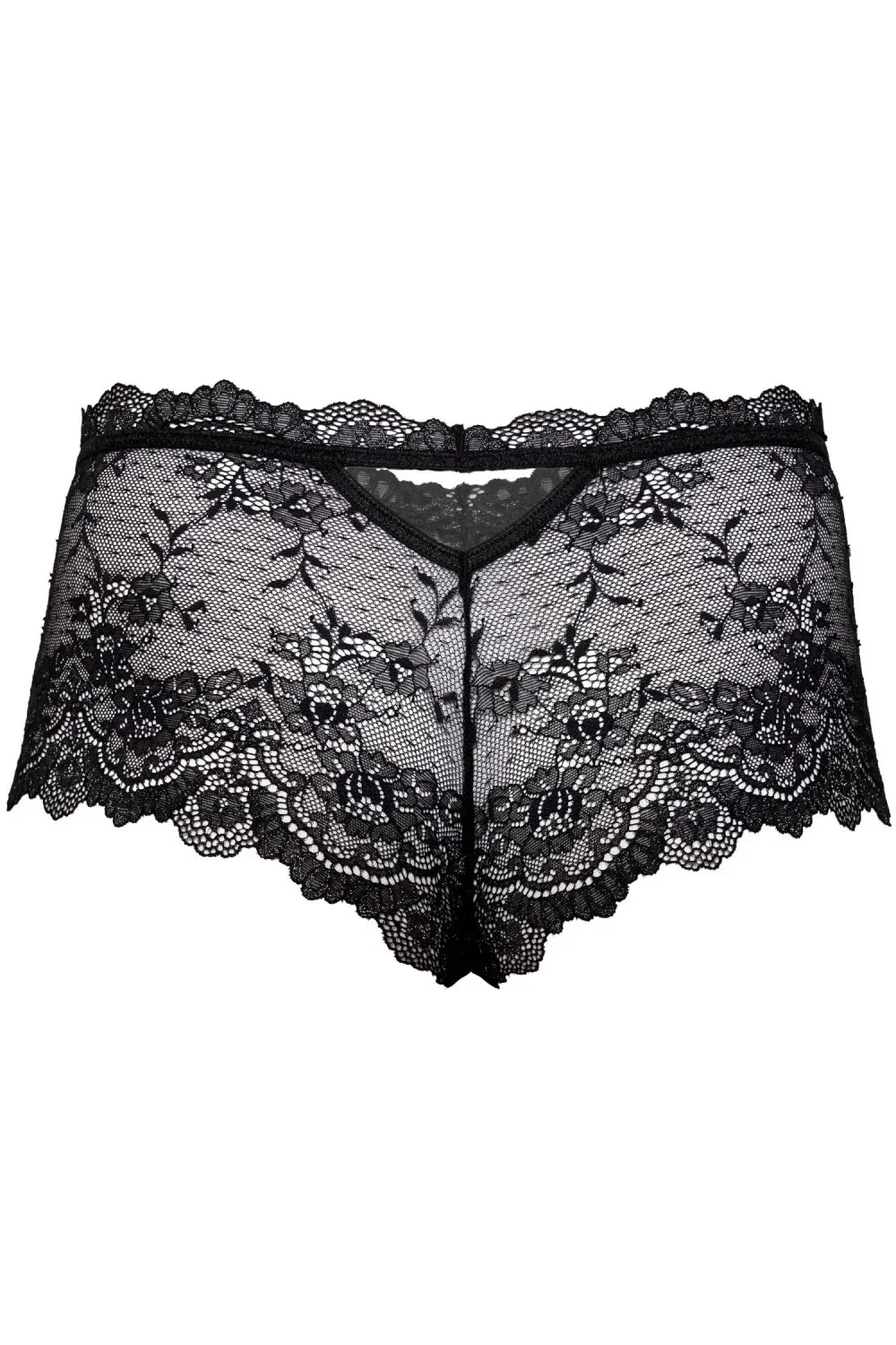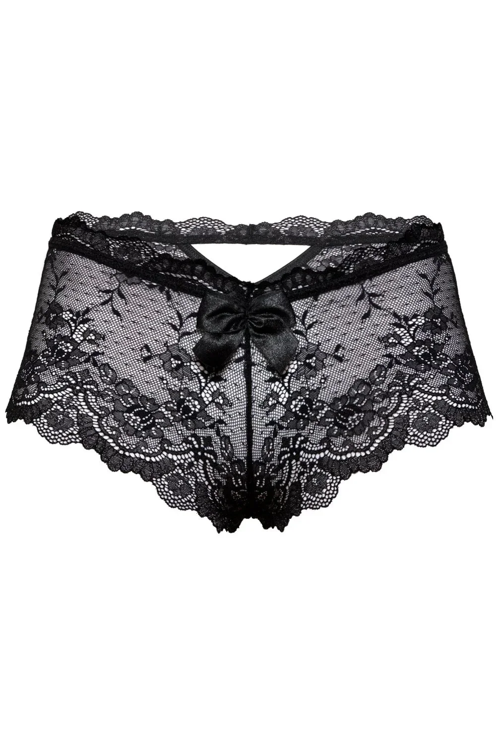 Dámské luxusní boxerky Mela Roza - v černé barvě - jsou celokrajkové, průsvitné a mírně lesklé - ve středu je velká lesklá mašle, která oživí boxerky