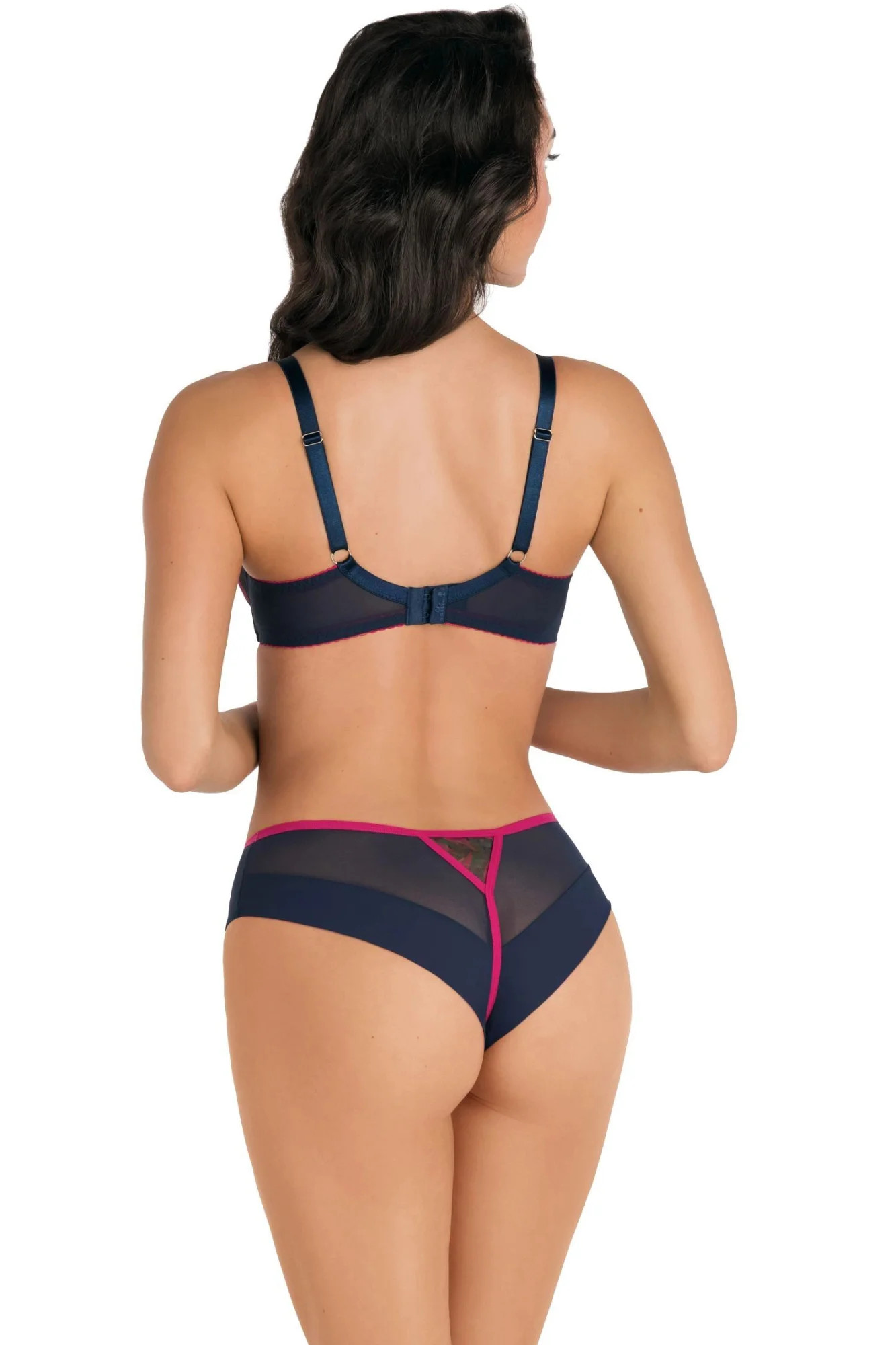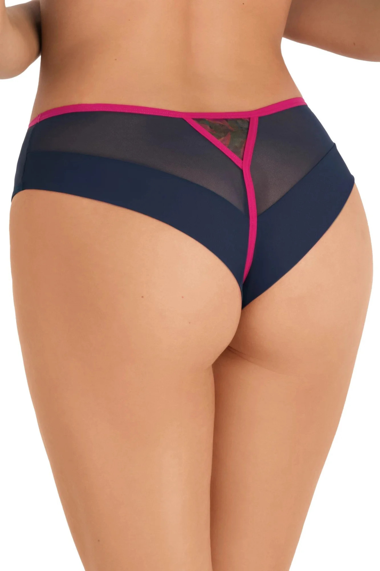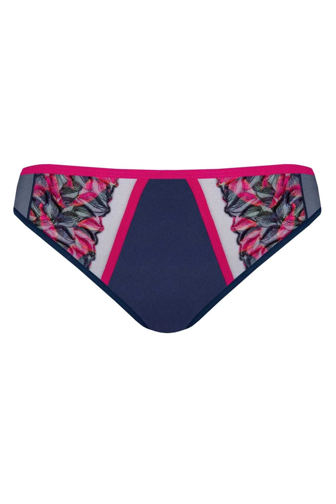 Dámské brazilky 791 Kayla GORSENIA - tmavě modrá barva - z pružného tylu - přední část zdobená fuchsiovou výšivkou s květinovým motivem - na bocích plné