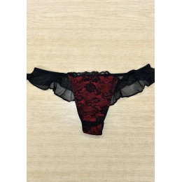 Elegantní krajkové kalhotky brazilkového střihu od značky Lovelygirl. Kalhotky mají velmi pružný a na dotyk příjemný tyl kolem boků, který dále pokračuje přes celou zadní část brazilek. Zakončení tylu tvoří hezké nařasení ve tvaru kanýrků po celé části. Přední část je podšitá bavlnou v červené barvě a na ní je pružná černá krajka.