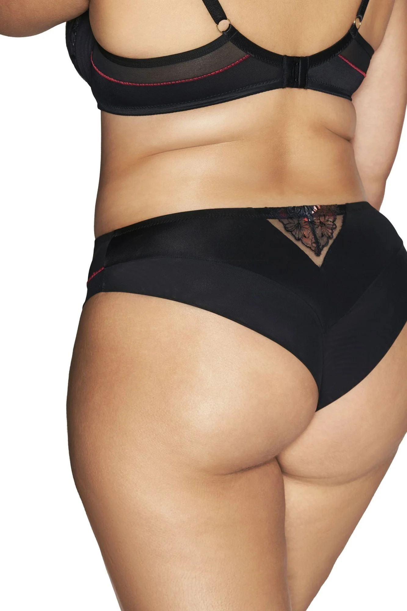 Dámské brazilky 2122 Intense AVA - černá barva - z hladkého elastického materiálu - kombinace transparentního tylu s barevnou výšivkou - na přední části je ozdobená jemnou bižuterií - ozdobné červené švy na bocích - na zadní části je ozdobná aplikace ve tvaru trojúhelníku