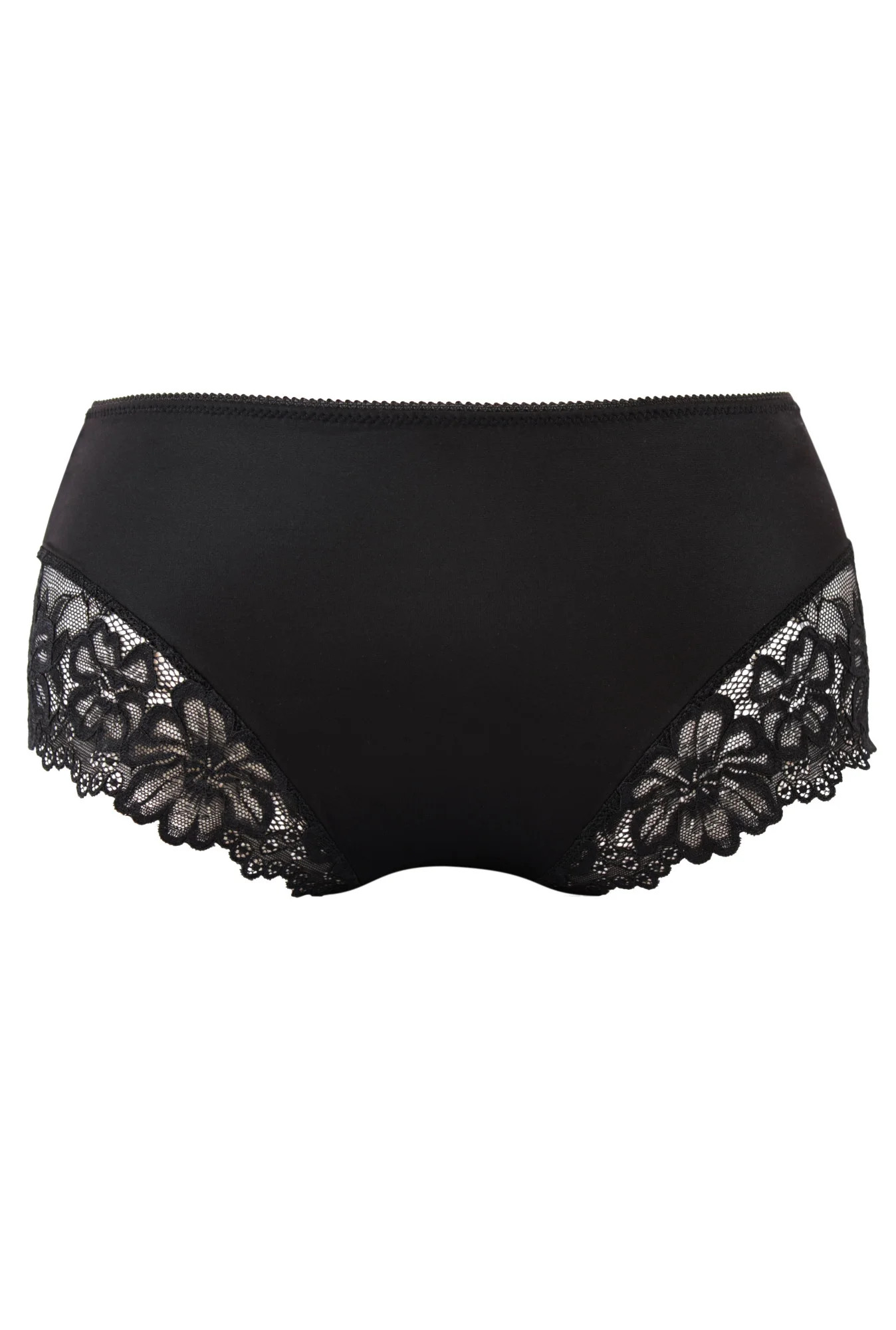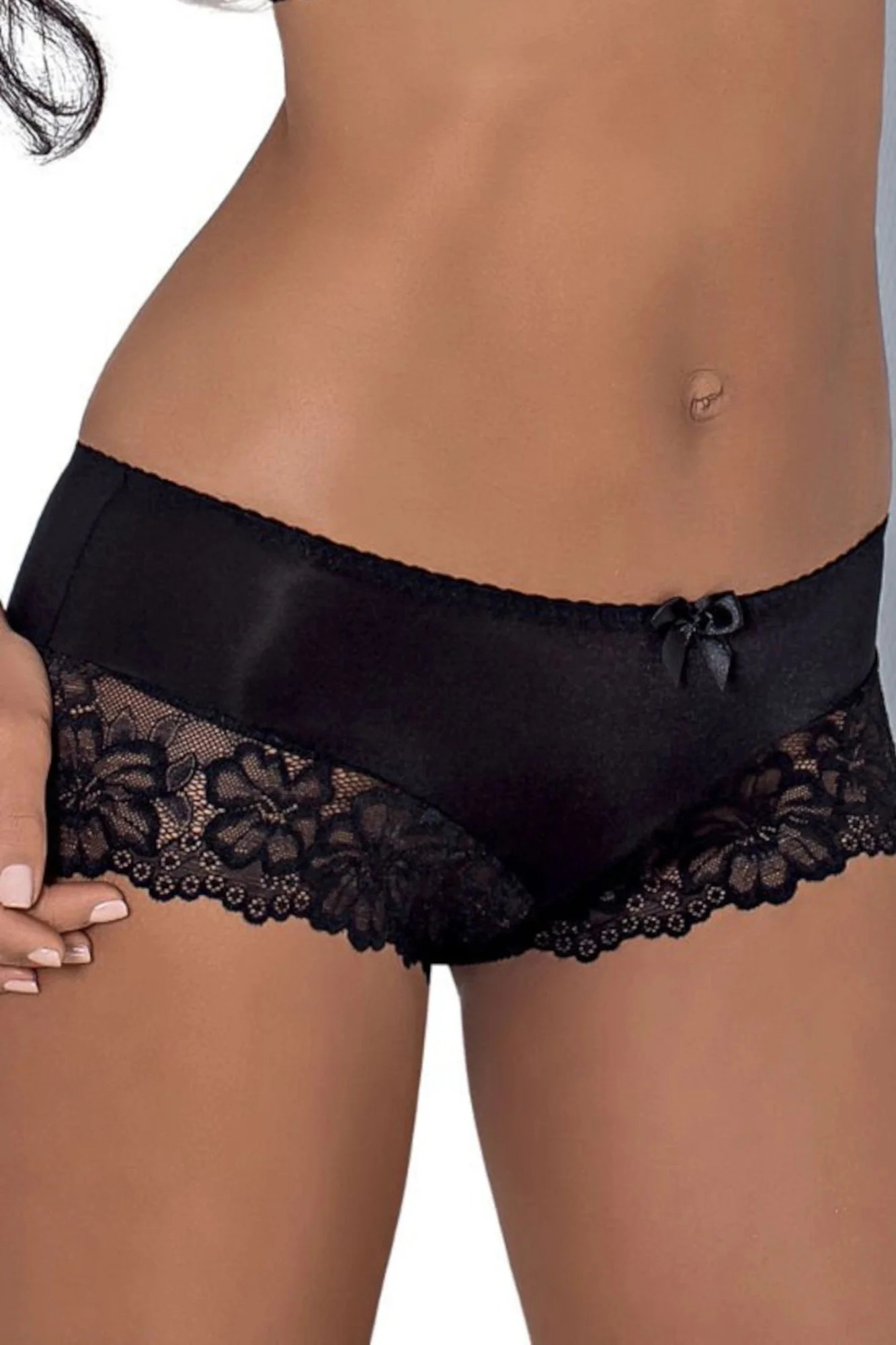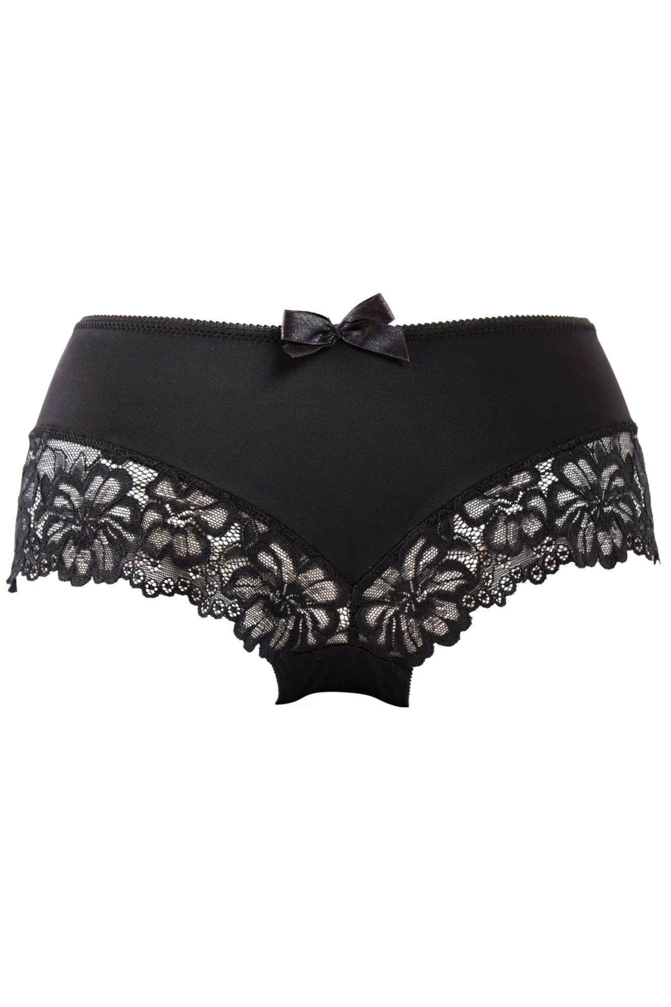 Dámské brazilky 053/5 Carmela black MAT - černá barva - z jemného mikrovlákna - nižší střih - boční a zadní část zdobené efektní krajkou s květinovým motivem - zdobené mašličkou