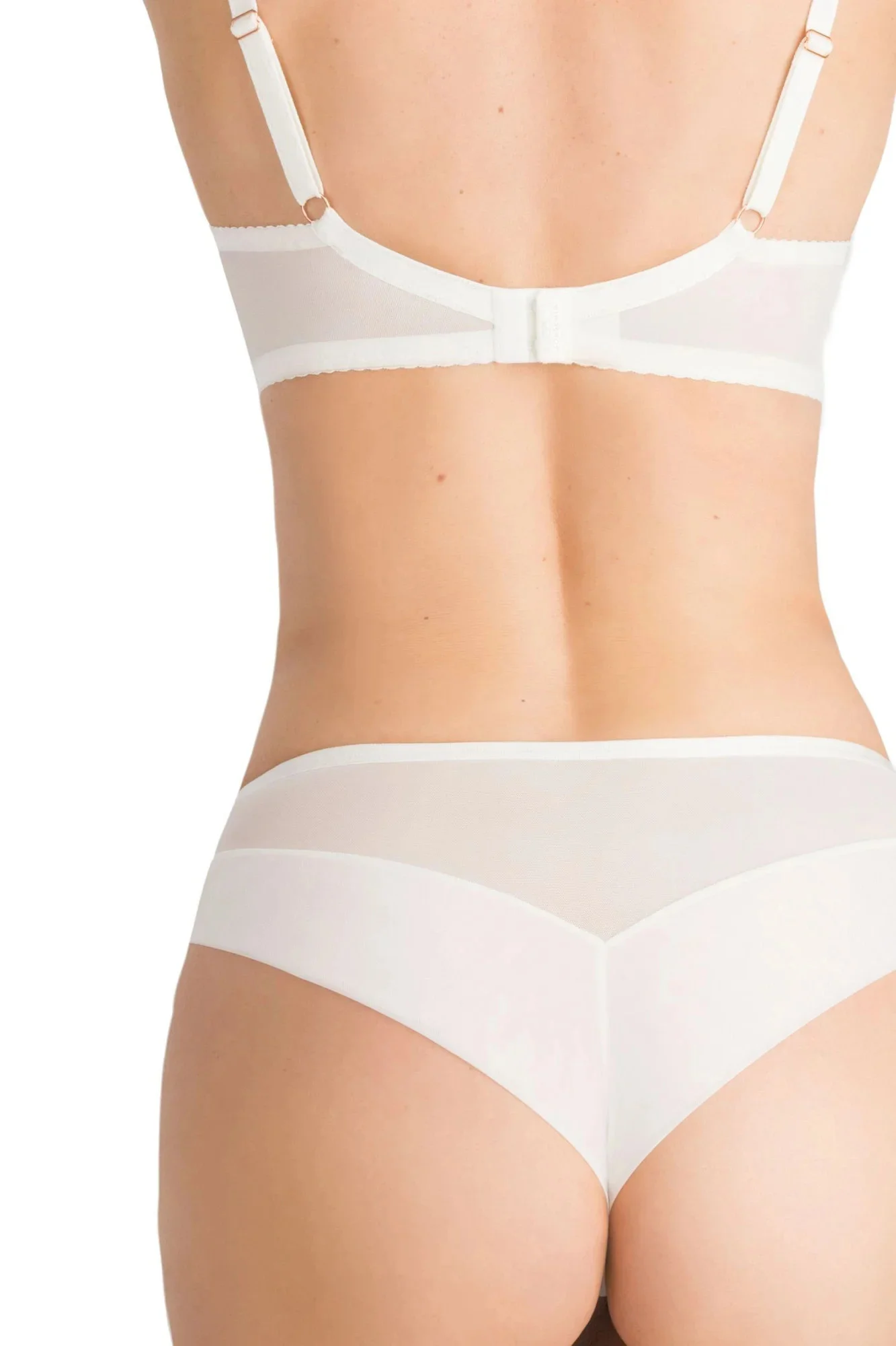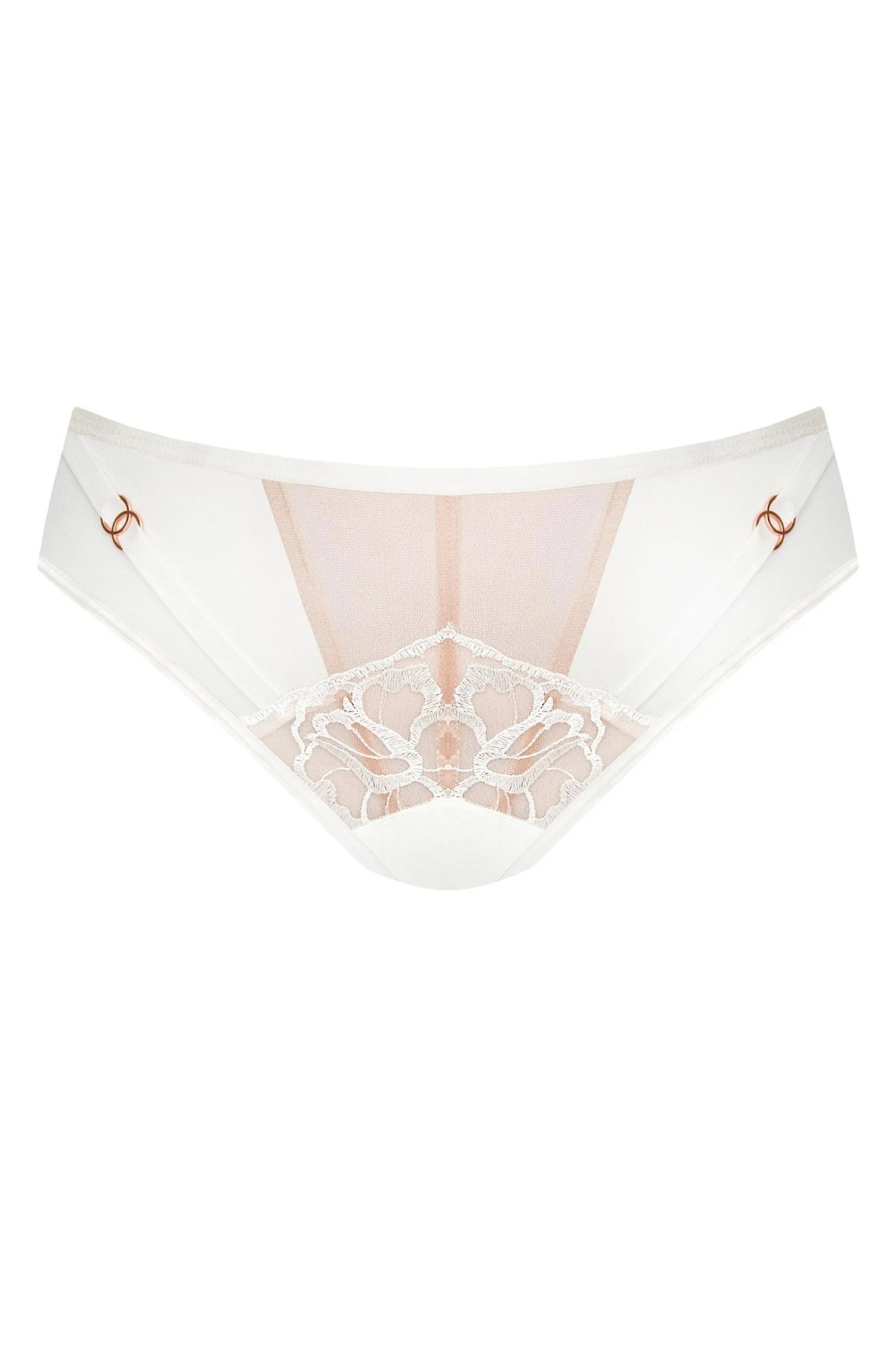 Dámské brazilky 869 Cotton candy GORSENIA - krémová barva - z elastického tylu - lesklá gumička s růžovo-zlatým prvkem - přední část zdobená výšivkou a tylem