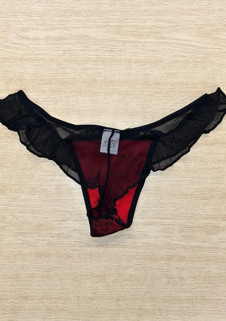 Elegantní krajkové kalhotky brazilkového střihu od značky Lovelygirl. Kalhotky mají velmi pružný a na dotyk příjemný tyl kolem boků, který dále pokračuje přes celou zadní část brazilek. Zakončení tylu tvoří hezké nařasení ve tvaru kanýrků po celé části. Přední část je podšitá bavlnou v červené barvě a na ní je pružná černá krajka.