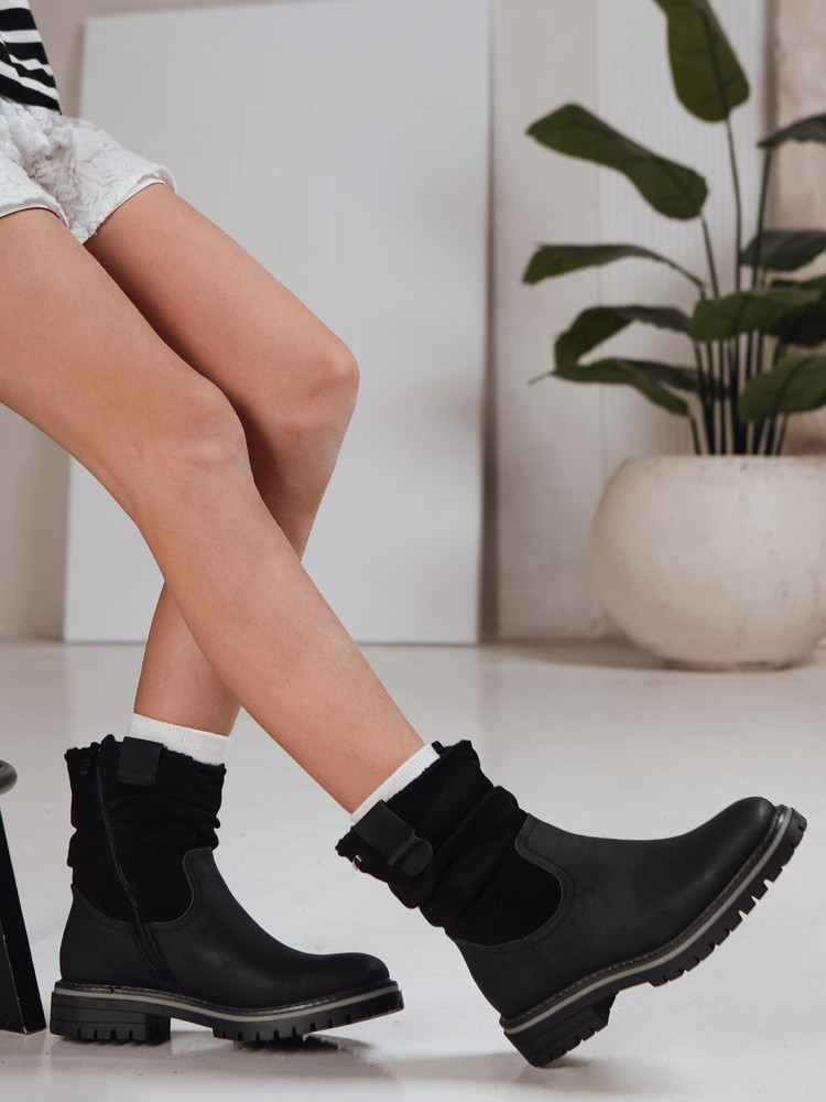 Kombinace ekokůže a semišových vložek dodává botám vrstvený efekt, který dodává celé konstrukci lehkost. Model se dobře hodí k sukním a šatům, stejně jako ke klasickým džínům. Díky měkké fleecové podšívce zajišťují boty tepelný komfort během chladnějšího počasí.
