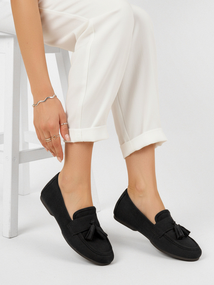 Mokasyny damskie o klasycznej formie sprawdzają się w codziennym użytkowaniu oraz stylizacjach smart casual. Wsuwany fason ułatwia szybkie zakładanie, a niski obcas sprzyja wygodzie podczas chodzenia. Ozdobne frędzle nadają im eleganckiego charakteru i podkreślają ponadczasowy styl. Miękka cholewka została wykonana ze sztucznego zamszu.