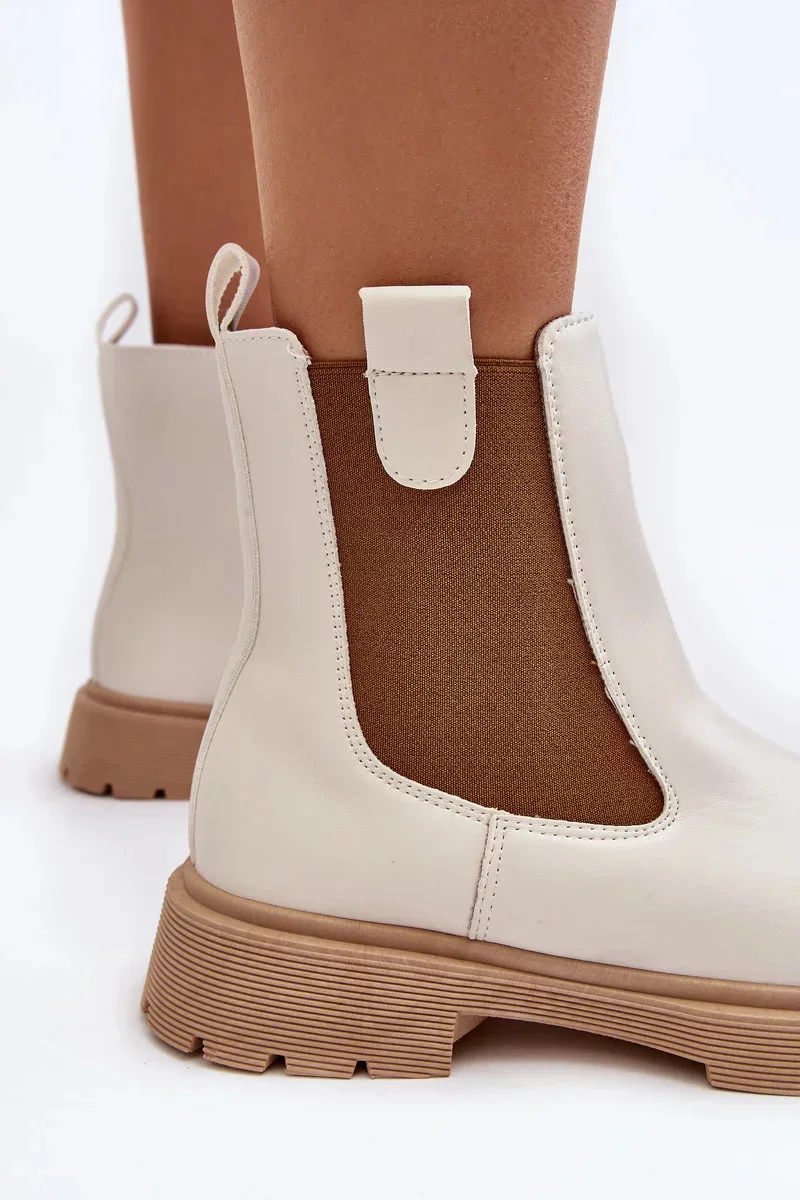 Dámské kotníkové boty nízkého střihu. Vyrobeno z eko kůže. Nasazené na plochém podpatku a silné podrážce. Elastické vsadky na svršku. Zaoblené prsty. Model se zapíná na zip na boku. Podpatek je vyztužený. Tento klasický styl můžete sladit téměř s každým podzimním stylingem! Při výběru velikosti se řiďte tabulkou velikostí.