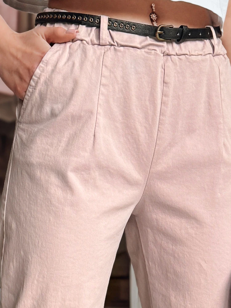 Dámské kalhoty volného střihu s vysokým pasem, které dokonale kombinují pohodlí a styl. Elastický pas zajišťuje pohodlné nošení, zatímco přiložený pásek dodává elegantní nádech. Praktické kapsy na přední straně a ozdobné kapsy na zadní straně podtrhují klasický charakter modelu. Ideální pro ležérní a městský styling.