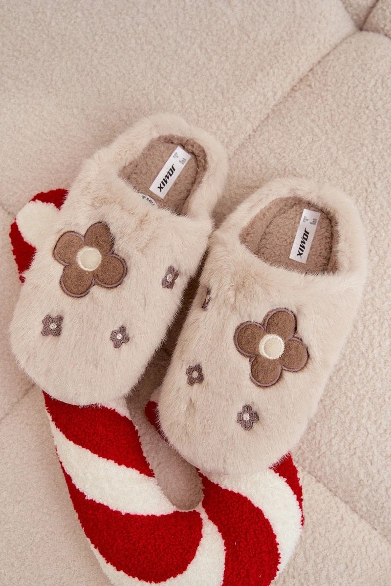 Dámské chlupaté papuče s květinami – béžové Selinne