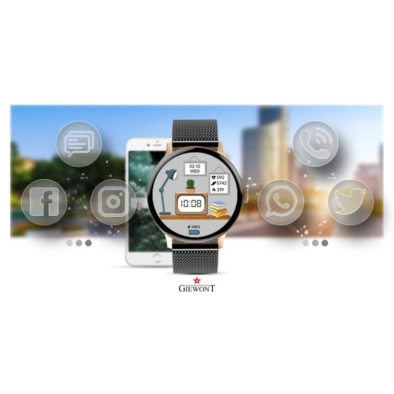 Smartwatch Damski GIEWONT GW330-4 to nowoczesny i stylowy dodatek, który doskonale łączy funkcjonalność z eleganckim, kobiecym designem. Został zaprojektowany tak, aby podkreślać indywidualny styl użytkowniczki, jednocześnie oferując praktyczne rozwiązania na każdy dzień. Smukła koperta i subtelne detale sprawiają, że zegarek prezentuje się wyjątkowo szykownie, a możliwość wymiany paska pozwala jeszcze lepiej dopasować go do stroju i okazji. Urządzenie oferuje szeroki zakres funkcji, które usprawniają codzienność. Można z niego rozmawiać, odczytu wiadomości i powiadomień z telefonu, przez kontrolę muzyki, aż po wygodne zdalne sterowanie aparatem. Wszystko to dostępne jest na wyraźnym, kolorowym ekranie, który zapewnia komfort obsługi niezależnie od warunków. GIEWONT GW330-4 wspiera również dbanie o zdrowie i dobre samopoczucie. Monitoruje tętno w czasie rzeczywistym, analizuje jakość snu oraz zlicza kroki i spalone kalorie, dzięki czemu możesz na bieżąco śledz