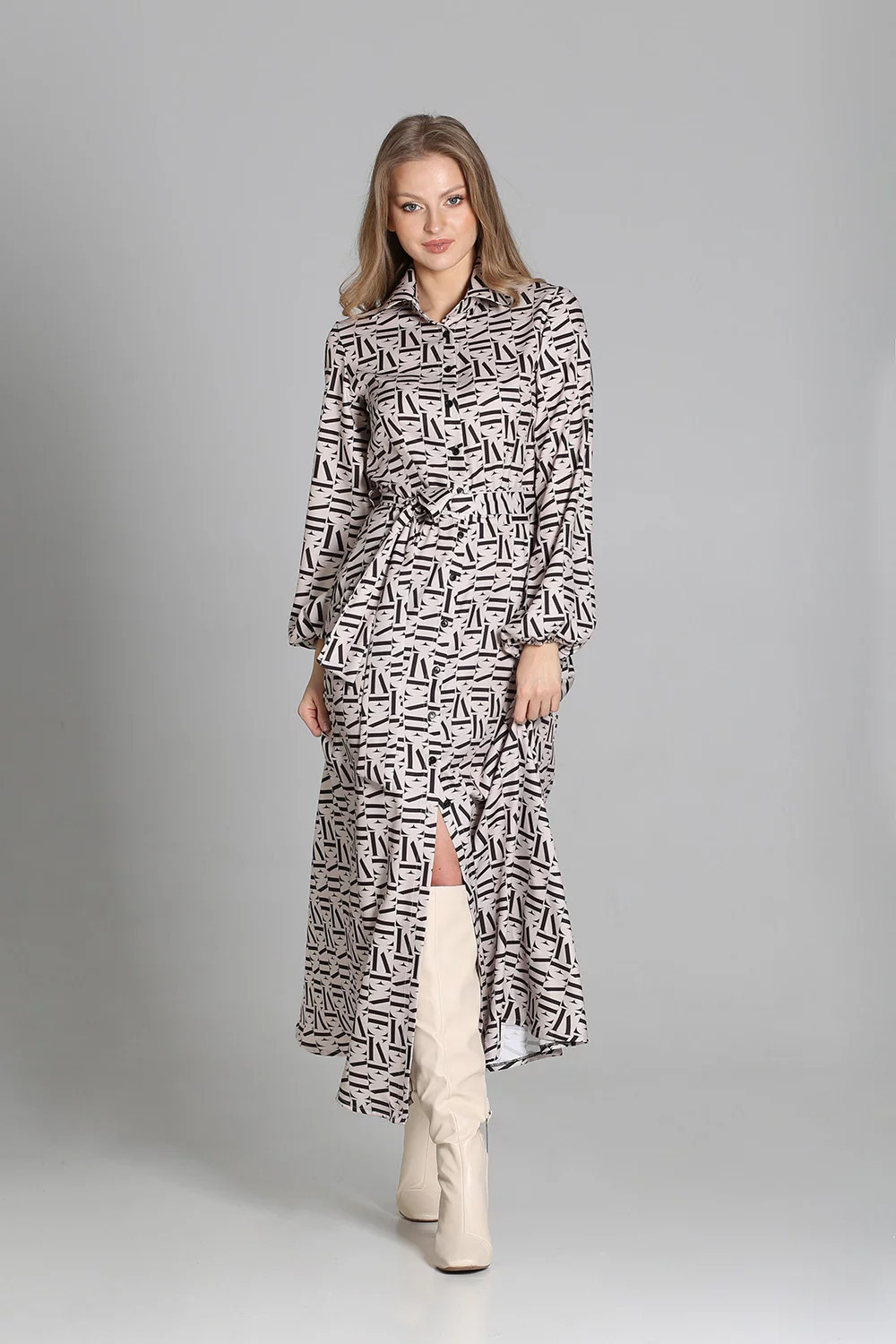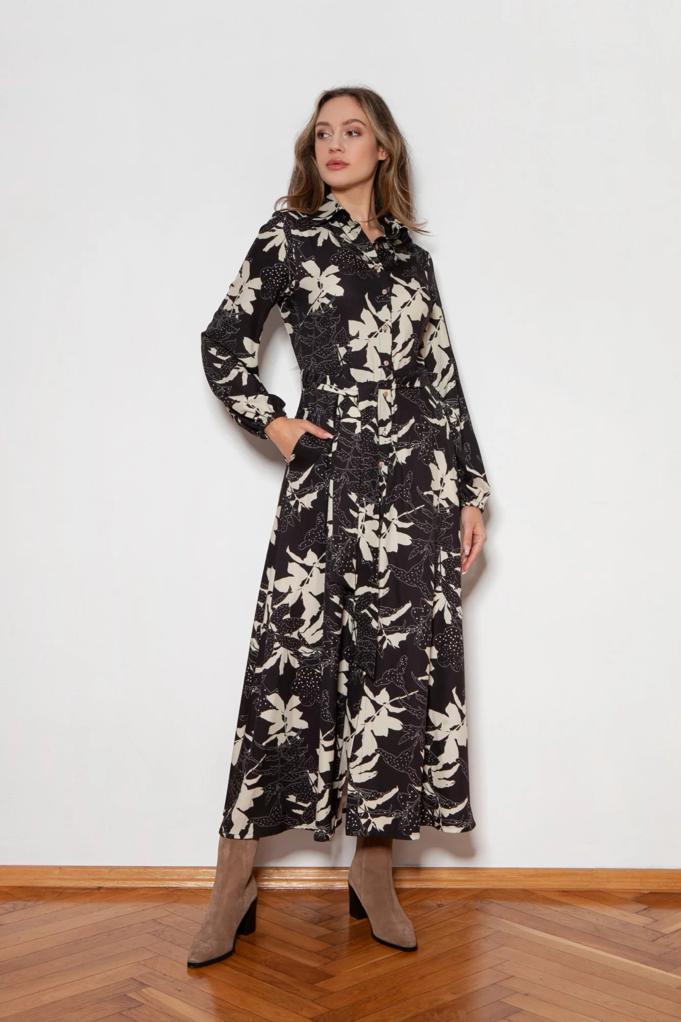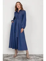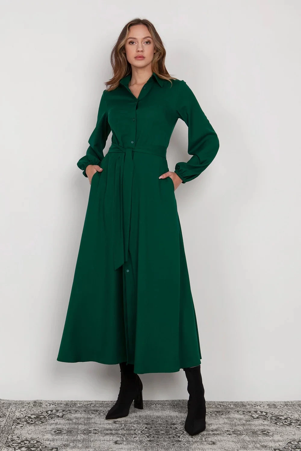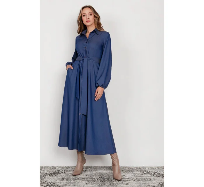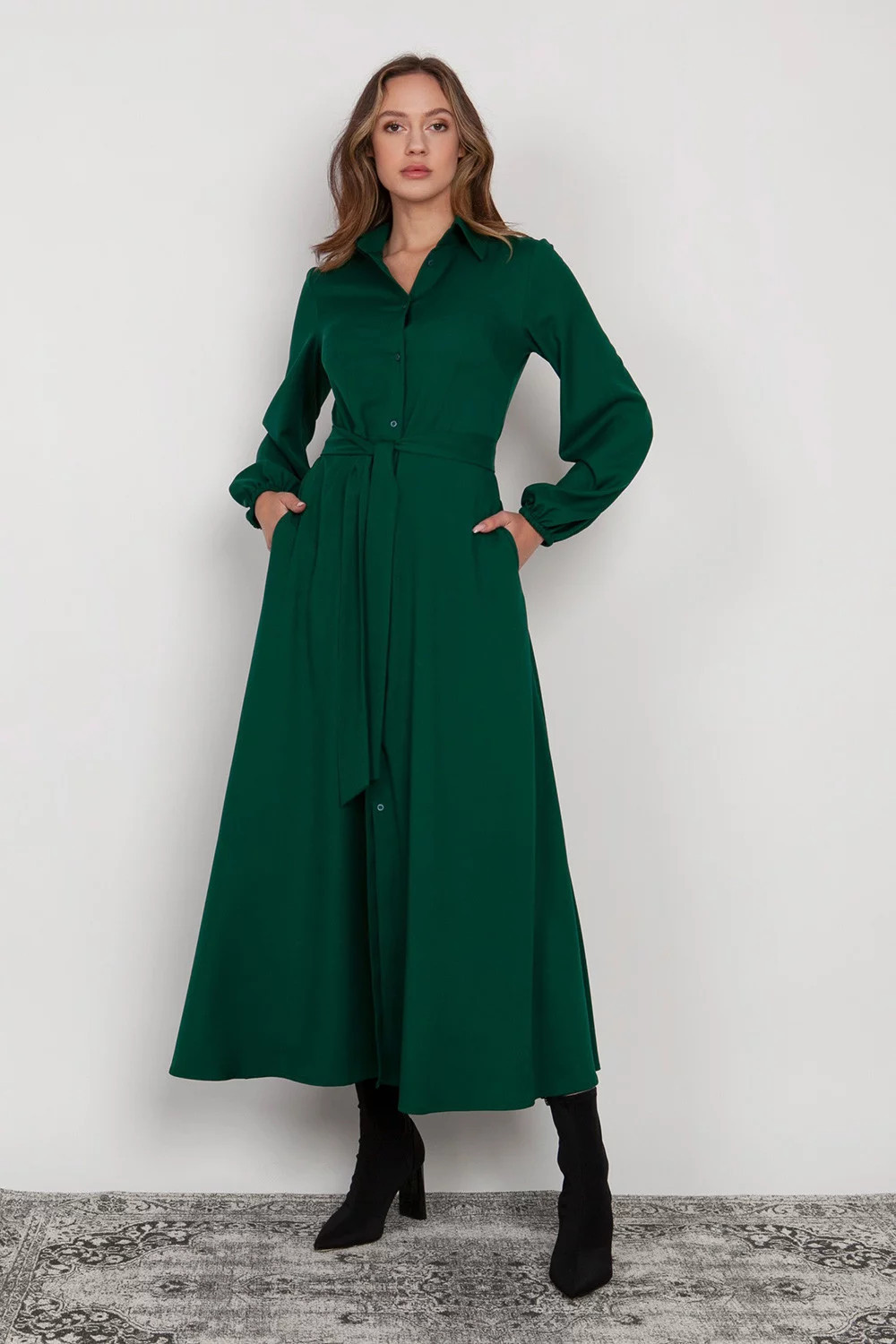 Dlouhé košilové šaty se zapínáním na knoflíky. Rozšířený lem s šerpou uvázanou v pase s poutky na pásek. Dlouhé rukávy zakončené gumičkou. Vyrobeno s důrazem na nejmenší detaily. A ano, samozřejmě má kapsy!