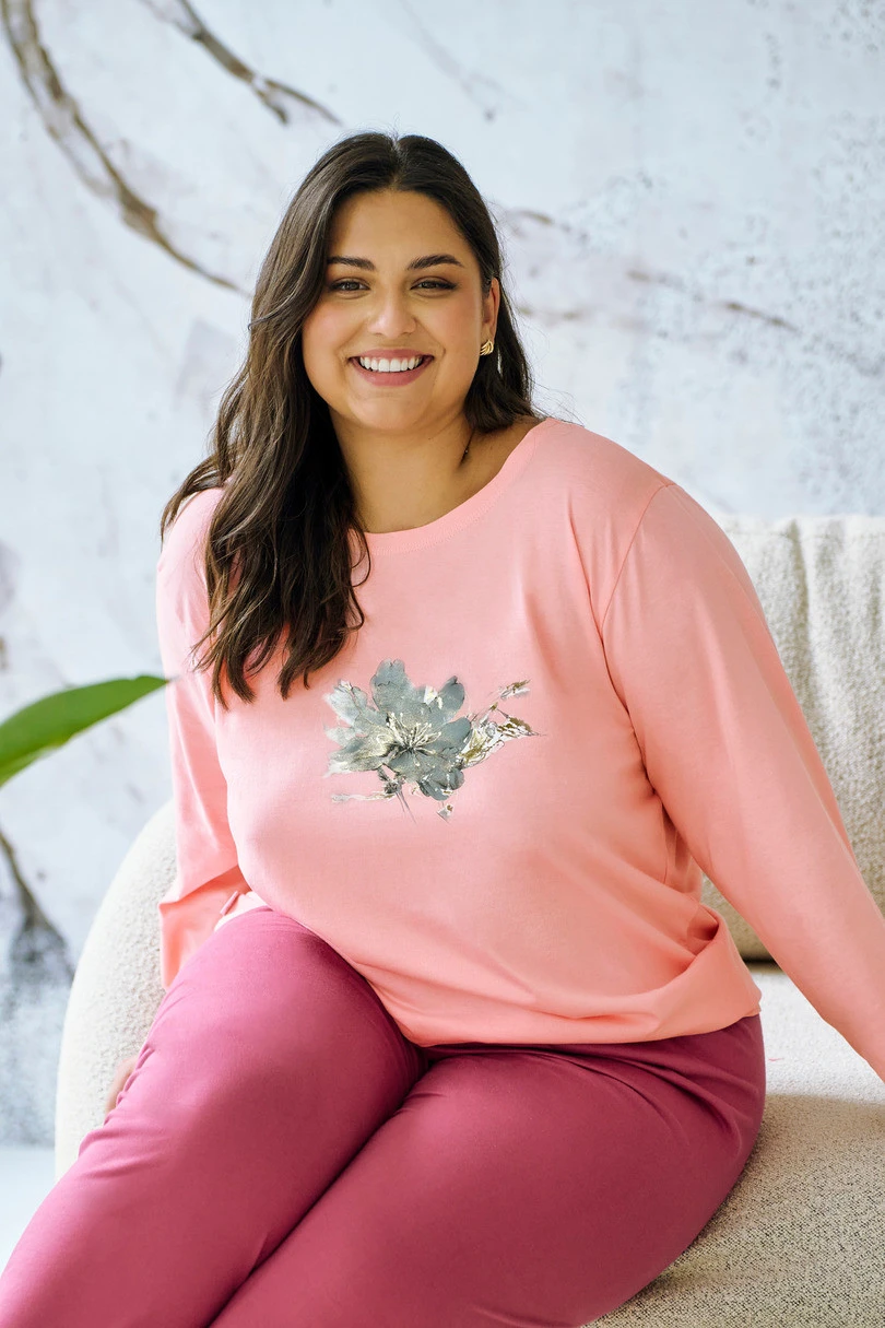 Piżama damska PATRICIA 3471 marki TARO to doskonały wybór dla kobiet, które poszukują połączenia wygody z subtelnym, kobiecym stylem. Wykonana w 100% z wysokogatunkowej, oddychającej bawełny, gwarantuje komfort termiczny oraz miękkość na skórze przez całą noc. Koszulka z długim rękawem i półokrągłym dekoltem ozdobiona jest połyskującym kwiatowym nadrukiem, który dodaje zestawowi elegancji. Spodnie typu rybaczki w kontrastowym kolorze wykończone są ozdobną kokardką w pasie, zapewniając wygodę i kobiecy akcent. Komplet dostępny w rozmiarach 2XL–4XL.