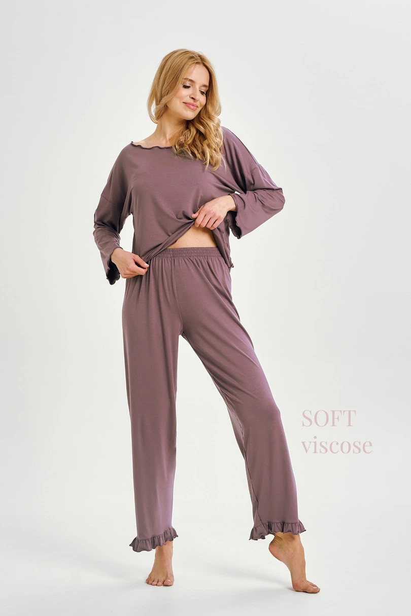 Piżama damska ZOYA to połączenie subtelnego wyglądu i wyjątkowego komfortu. Wykonana z miękkiej i elastycznej dzianiny wiskozowej (94% wiskoza, 6% elastan), delikatnie otula ciało i zapewnia maksymalną swobodę ruchów. Koszulka z długim rękawem ma kobiecy dekolt w łódeczkę, wykończony lekką falą, podobnie jak rękawy. Długie, proste spodnie zakończone są uroczą falbanką przy nogawkach, co dodaje zestawowi romantycznego charakteru. Doskonała do snu, relaksu w domu, a także jako stylowy komplet homewear.