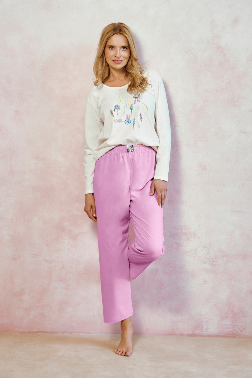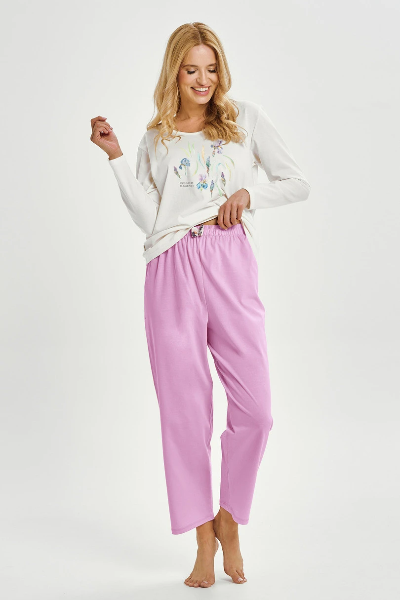 Dlouhé dámské pyžamo MONICA 3459 je ideální volbou pro ženy, které ocení pohodlí při spánku a jemný, ženský styl. Je vyrobeno z měkké, 100% bavlny, dokonale obepíná tělo a zajišťuje pohodlí po celou noc. Tričko s dlouhými rukávy zdobí na přední straně barevný, květinový potisk, zatímco dlouhé kalhoty v kontrastní barvě dodávají soupravě moderní nádech. V pase je měkká guma a ozdobná mašle, které zaručují dokonalé přizpůsobení a estetické zakončení.