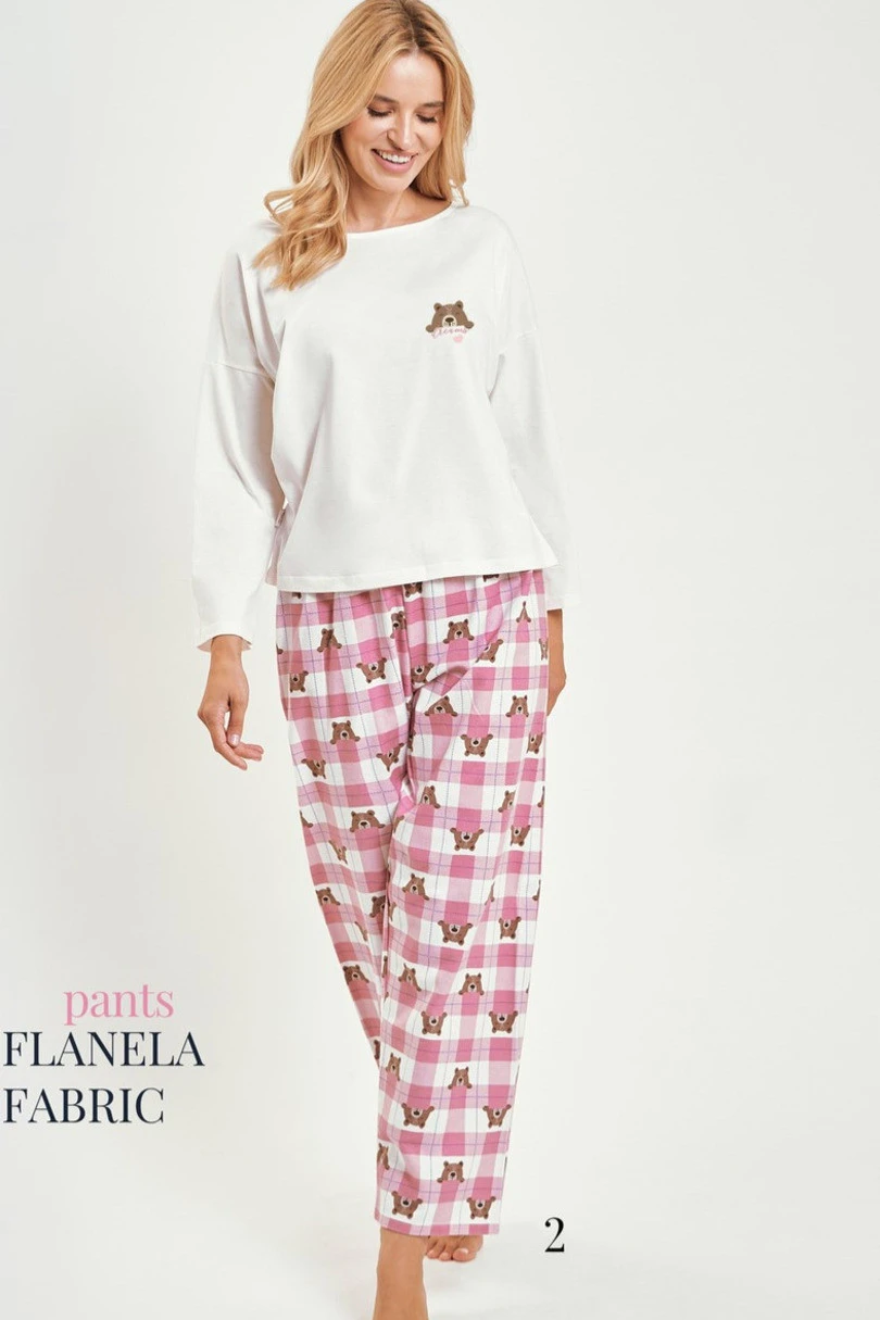 Dámské pyžamo Astrid 3441 je ideální pro chladnější noci. Je vyrobeno ze 100% měkké, prodyšné bavlny a poskytuje přirozený komfort při spánku. Vrchní část pyžama tvoří volné tričko s dlouhými rukávy, kulatým výstřihem a decentním potiskem na hrudi. Spodní část tvoří flanelové kalhoty v módním kostkovaném vzoru s elastickým pasem, který zaručuje volnost pohybu a pohodlí po celou noc.