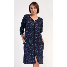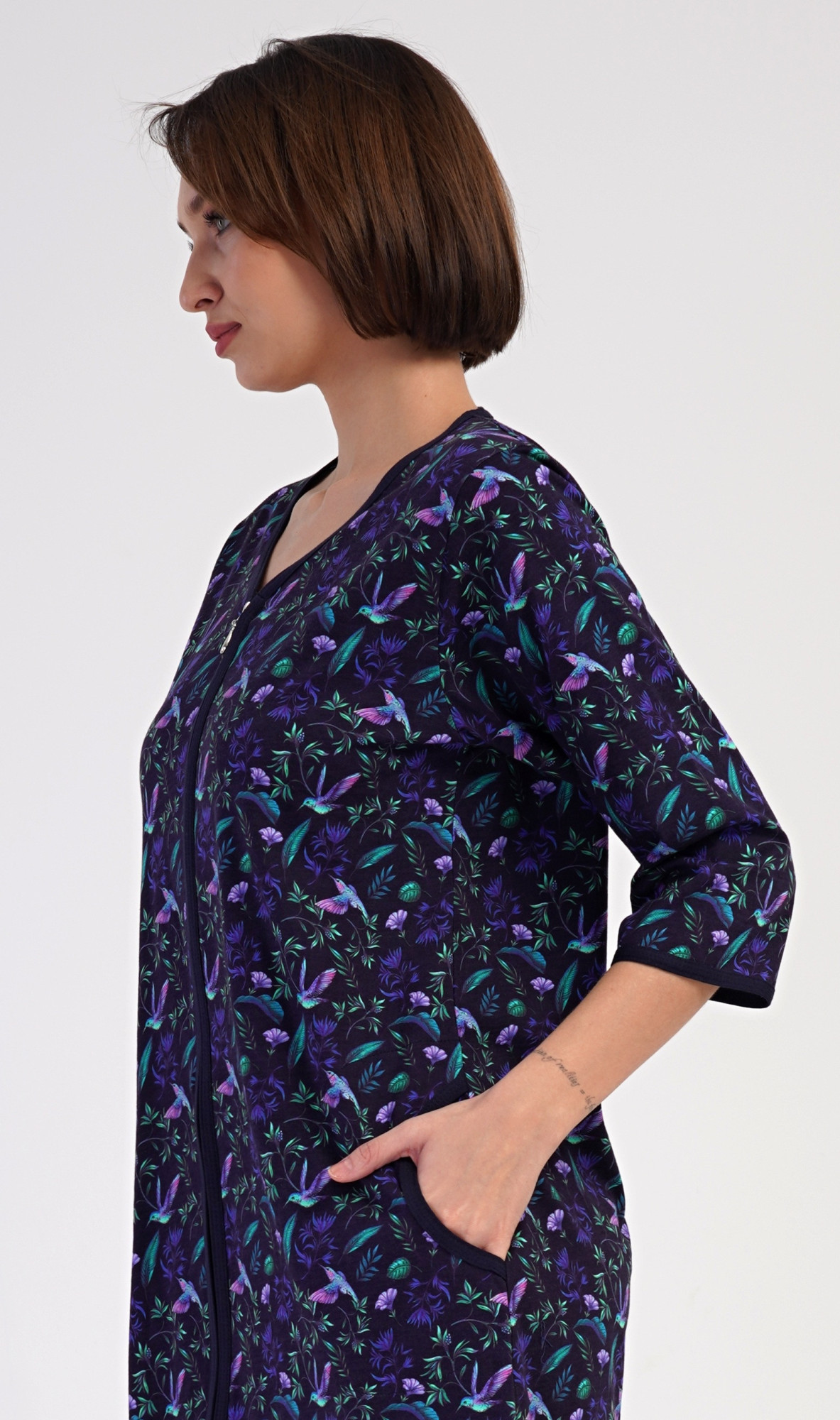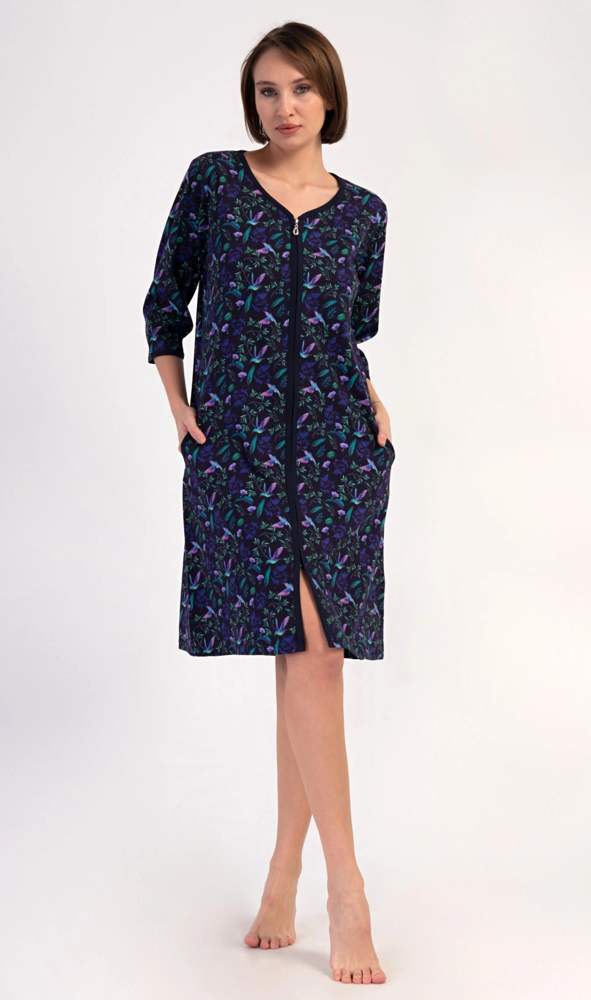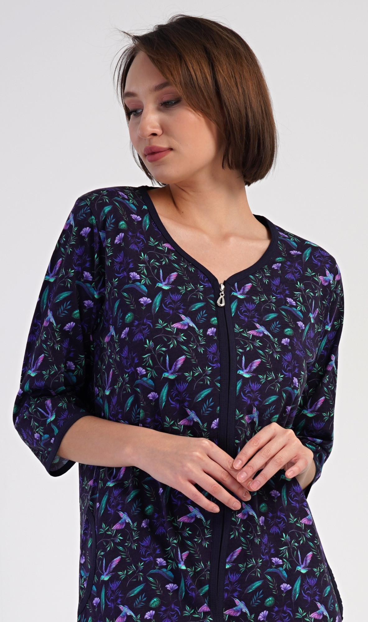 Dámské bavlněné domácí šaty s tříčtvrtečním rukávem Kolibřík. Pohodlné rozepínací šaty v příjemné délce pod kolena využijete téměř při všech volnočasových aktivitách. Mají praktické kapsy a zapínání na zip. Šaty jsou potištěny kolibříky. Použitý bavlněný materiál je příjemný a poddajný na dotek.