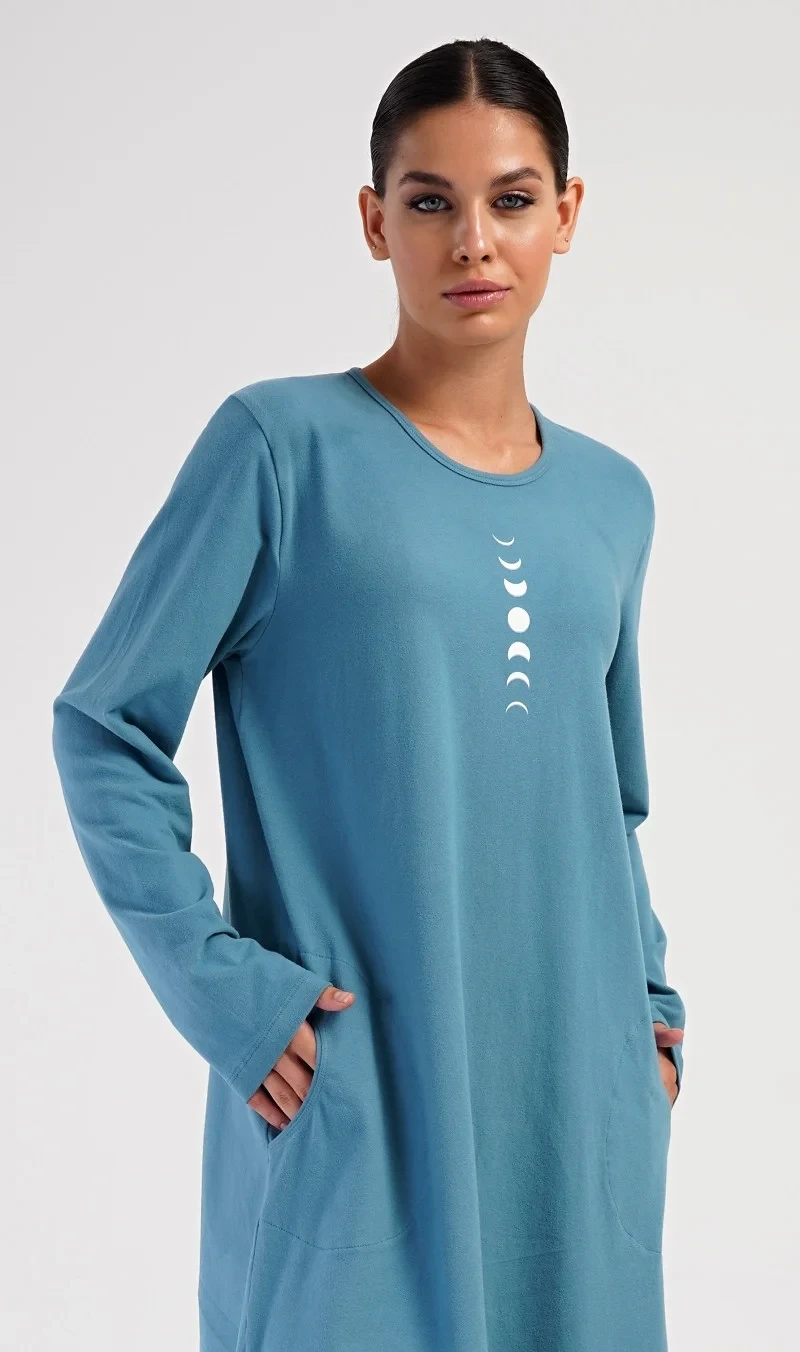 Dámské domácí šaty s dlouhým rukávem Alžběta. Jednobarevné domácí šaty s délkou po kolena, kulatým výstřihem a kapsami zdobí potisk v bílé barvě ve tvaru měsíčních fází. Použitý bavlněný materiál s příměsí elastenu je příjemný a poddajný na dotek.