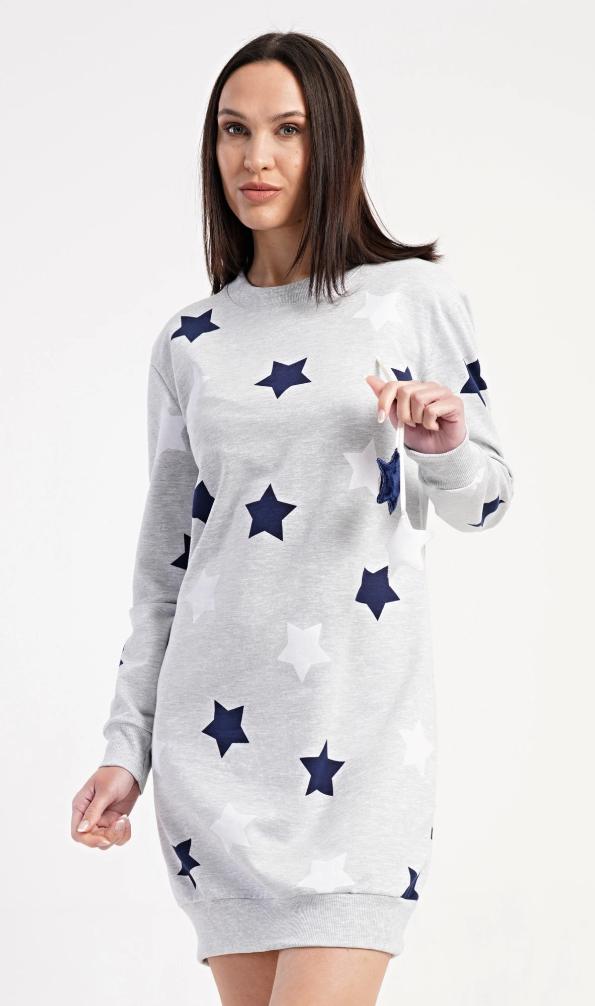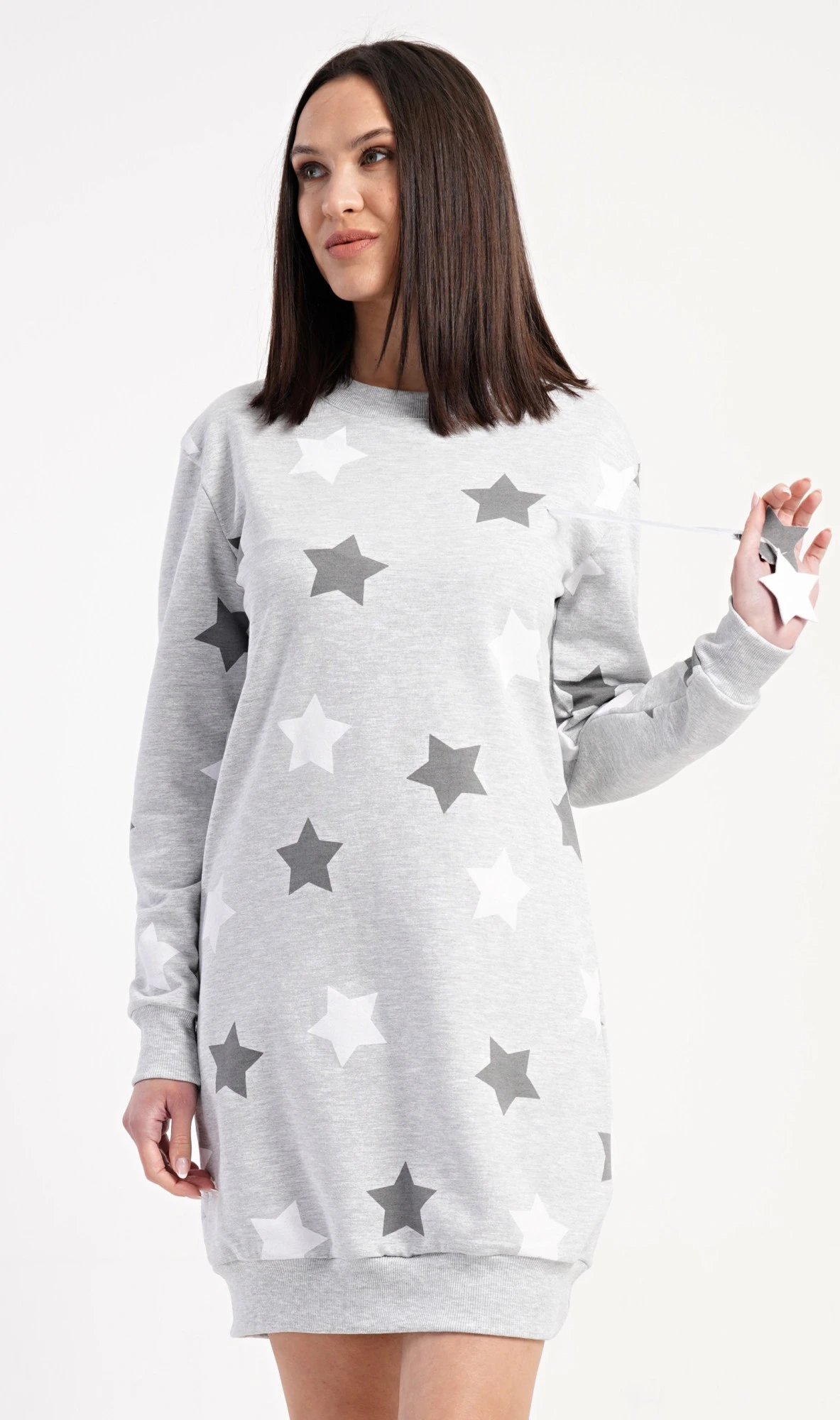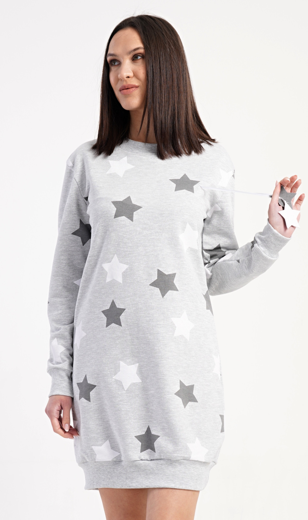 Dámské domácí šaty s dlouhým rukávem Hvězdy. Pohodlné domácí šaty s dlouhým rukávem a kulatým výstřihem zdobí potisk hvězd. Použitý oteplený materiál s obsahem bavlny 70% je příjemný a poddajný na dotek.
