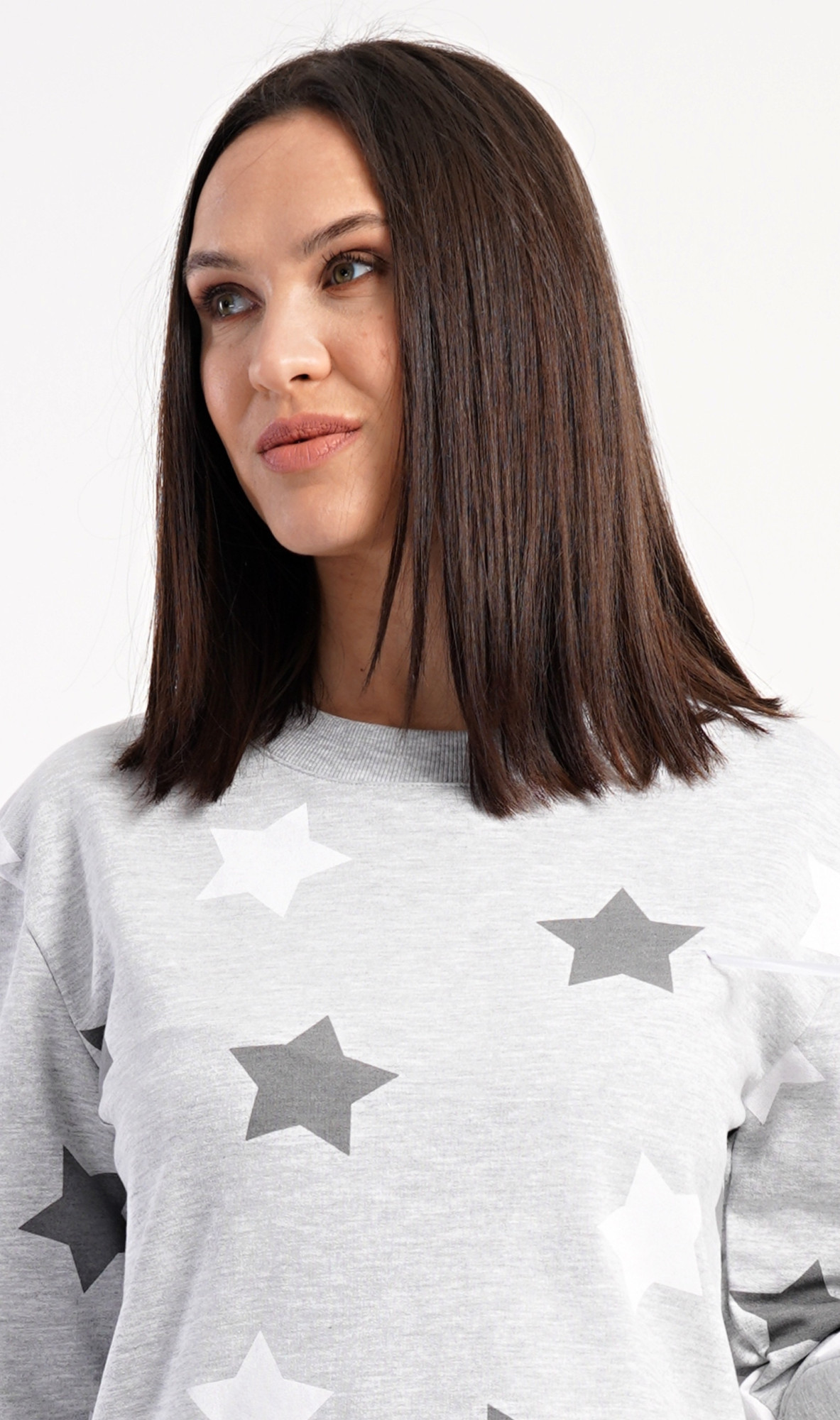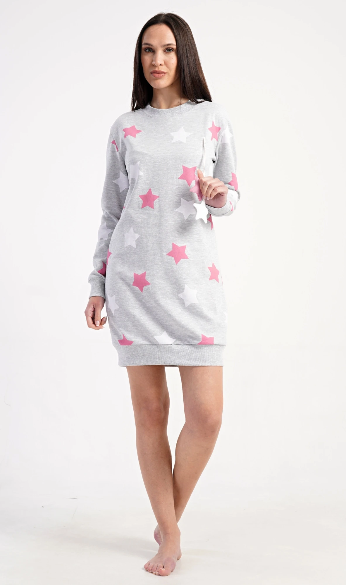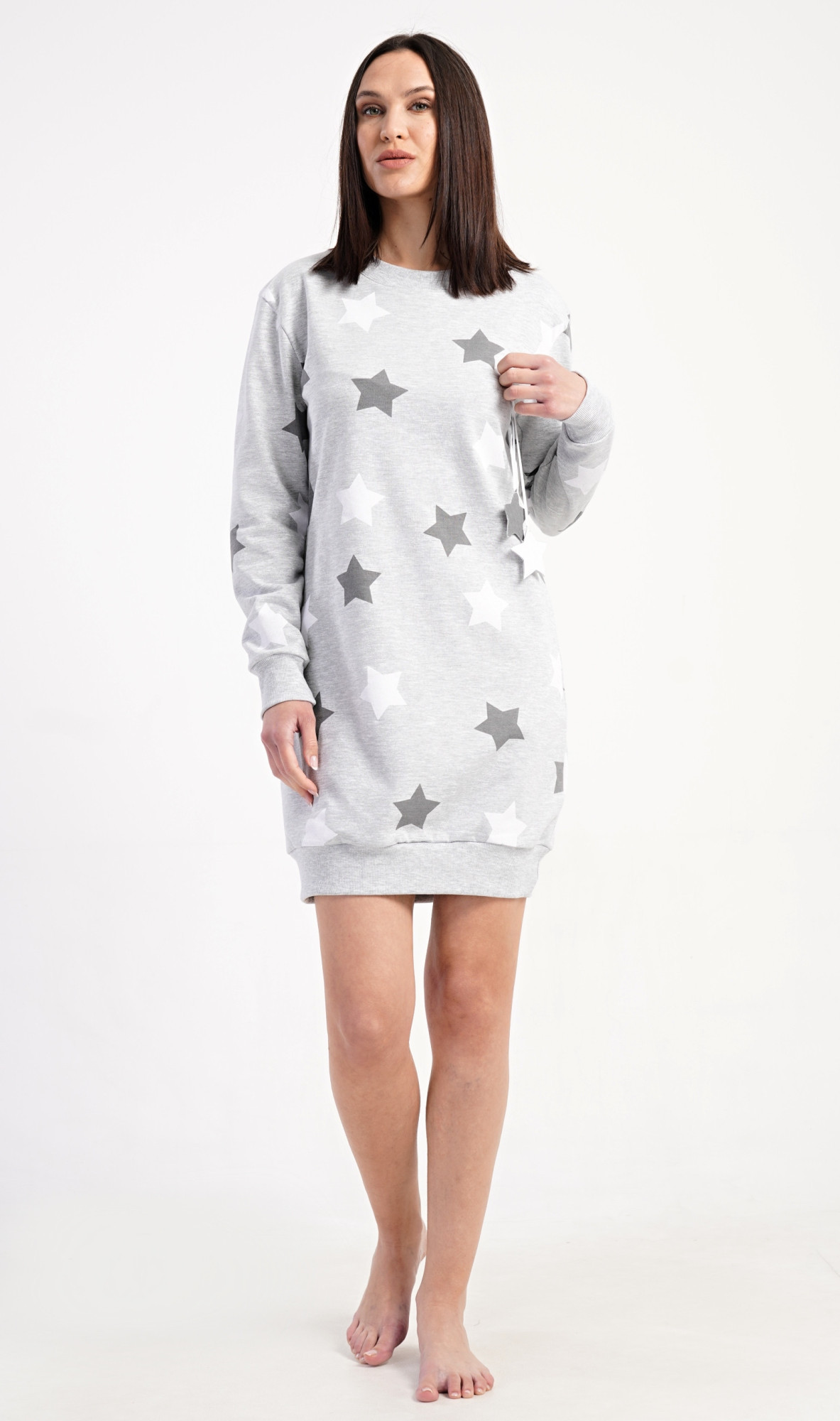 Dámské domácí šaty s dlouhým rukávem Hvězdy. Pohodlné domácí šaty s dlouhým rukávem a kulatým výstřihem zdobí potisk hvězd. Použitý oteplený materiál s obsahem bavlny 70% je příjemný a poddajný na dotek.