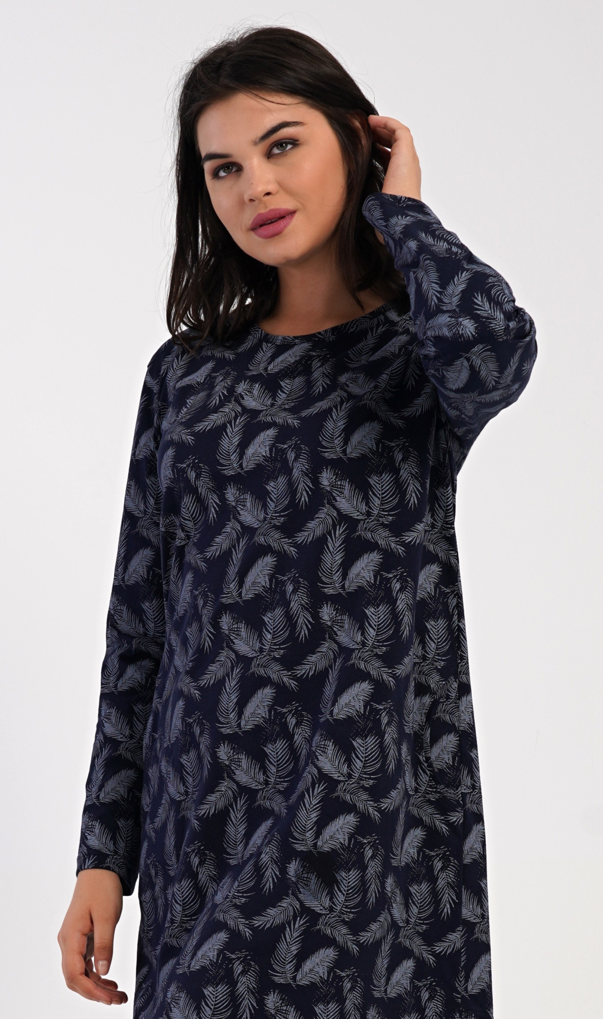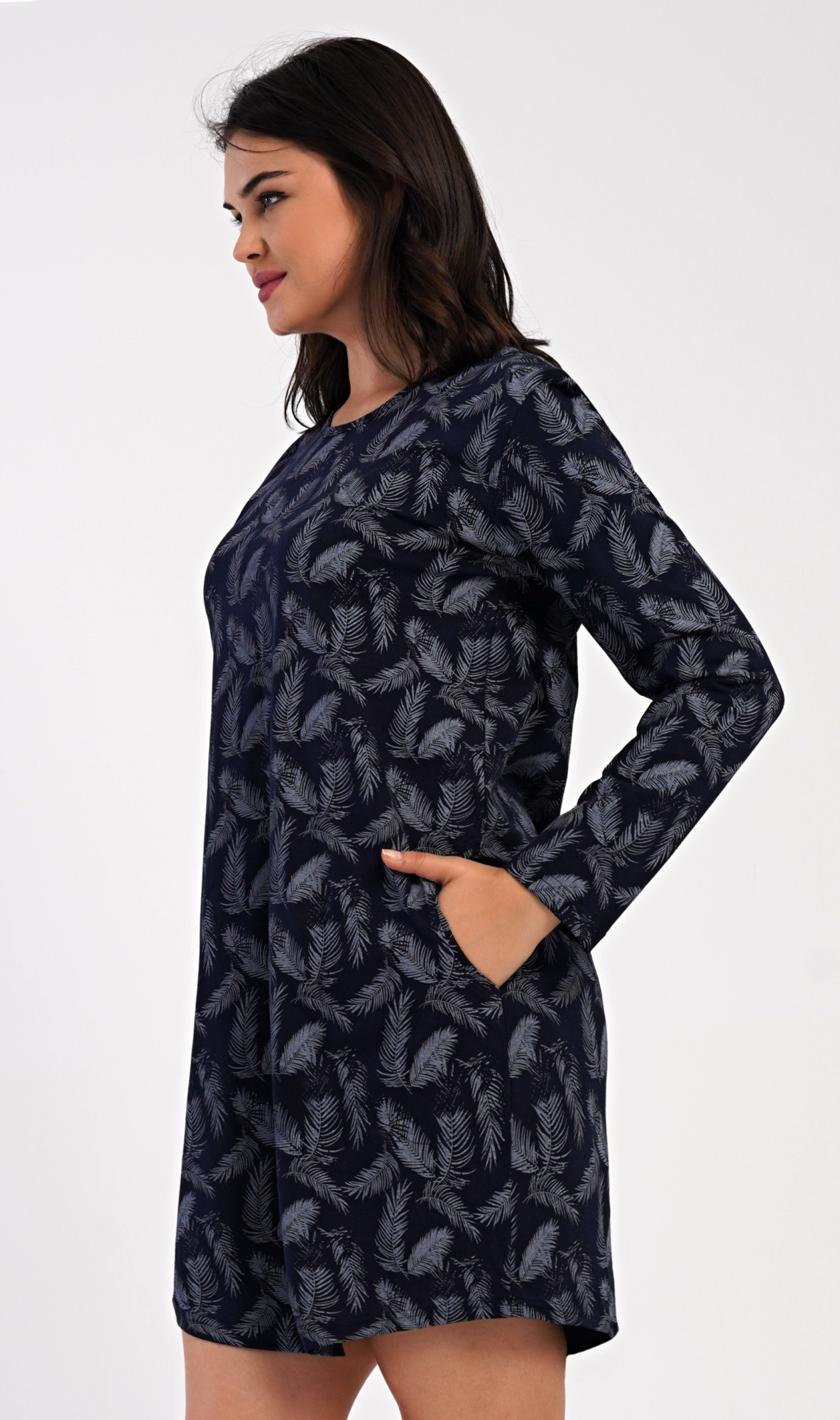 Dámské bavlněné domácí šaty s dlouhým rukávem Isabela. Domácí šaty s kulatým výstřihem a kapsami zdobí potisk peříček. Použitý bavlněný materiál je příjemný a poddajný na dotek.