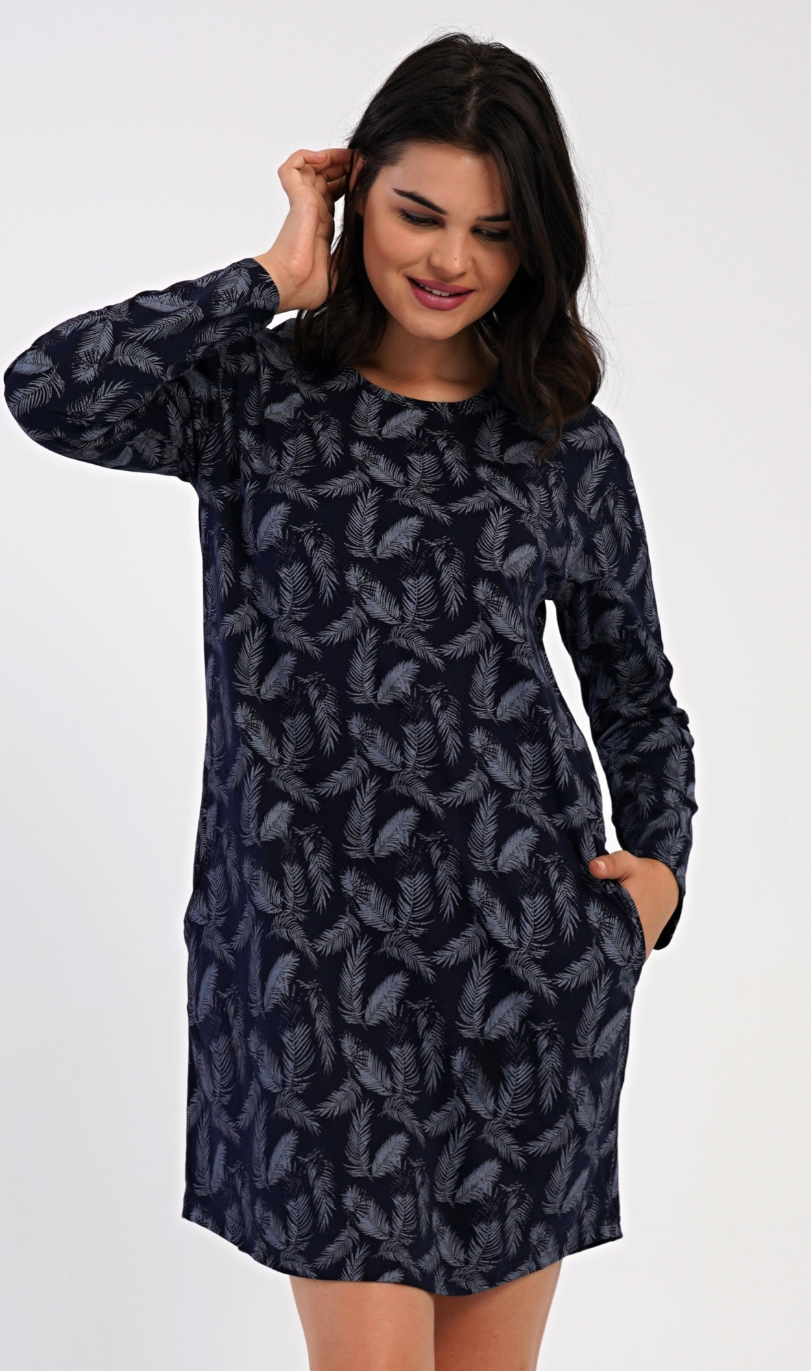 Dámské bavlněné domácí šaty s dlouhým rukávem Isabela. Domácí šaty s kulatým výstřihem a kapsami zdobí potisk peříček. Použitý bavlněný materiál je příjemný a poddajný na dotek.