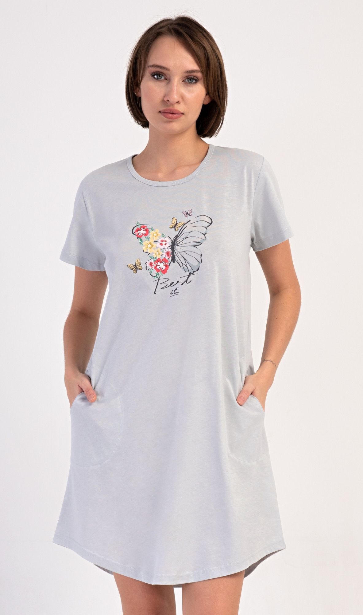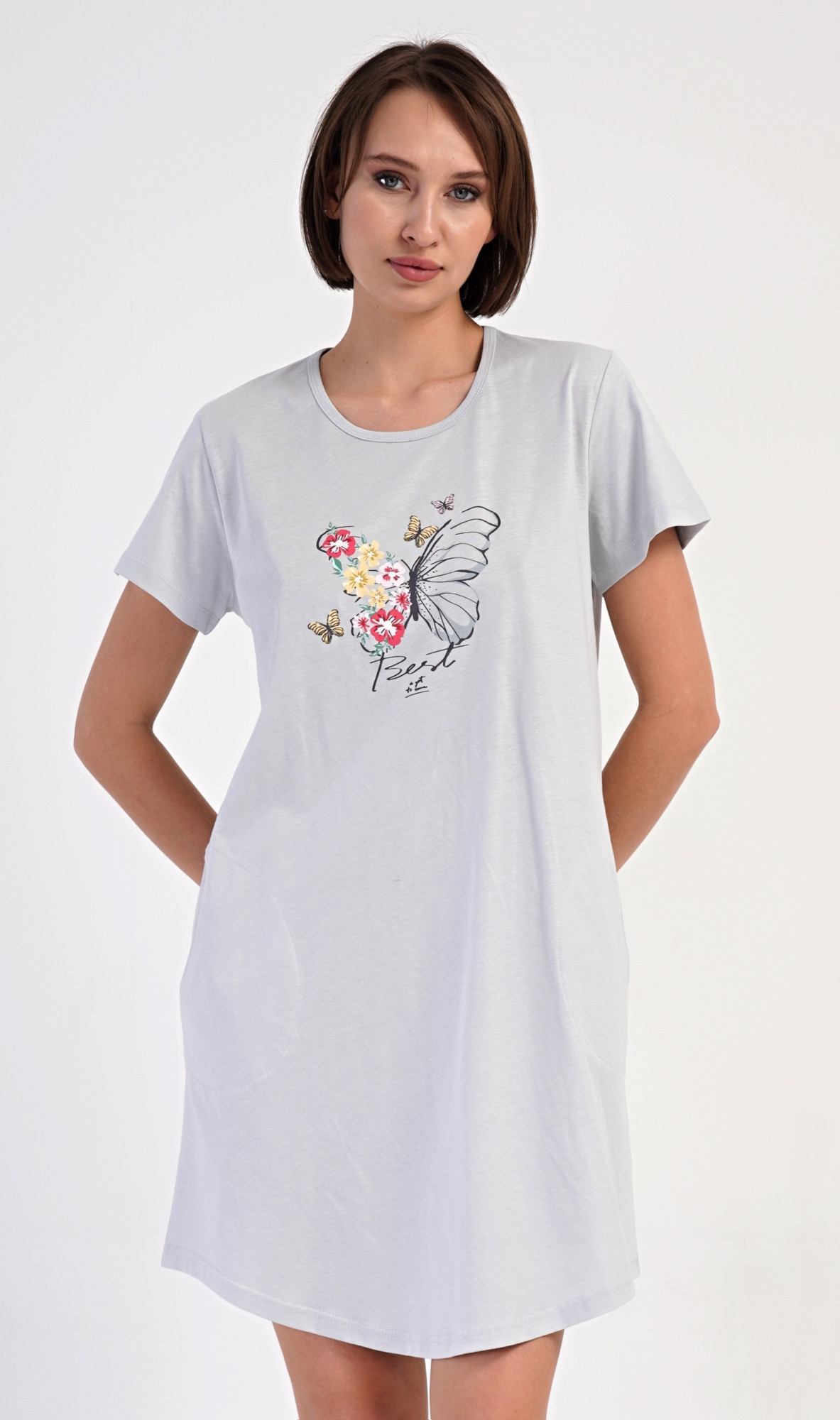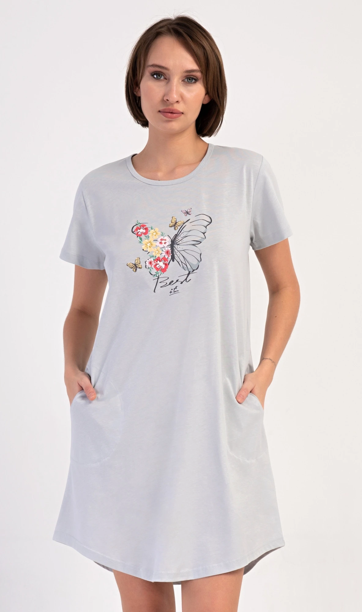 Dámské bavlněné domácí šaty s krátkým rukávem Amelia. Domácí jednobarevné šaty s kulatým výstřihem a kapsami zdobí na hrudi obrázek motýla a květů. Použitý bavlněný materiál je příjemný a poddajný na dotek. Šaty jsou pohodlné, vhodné na spaní i na denní nošení.