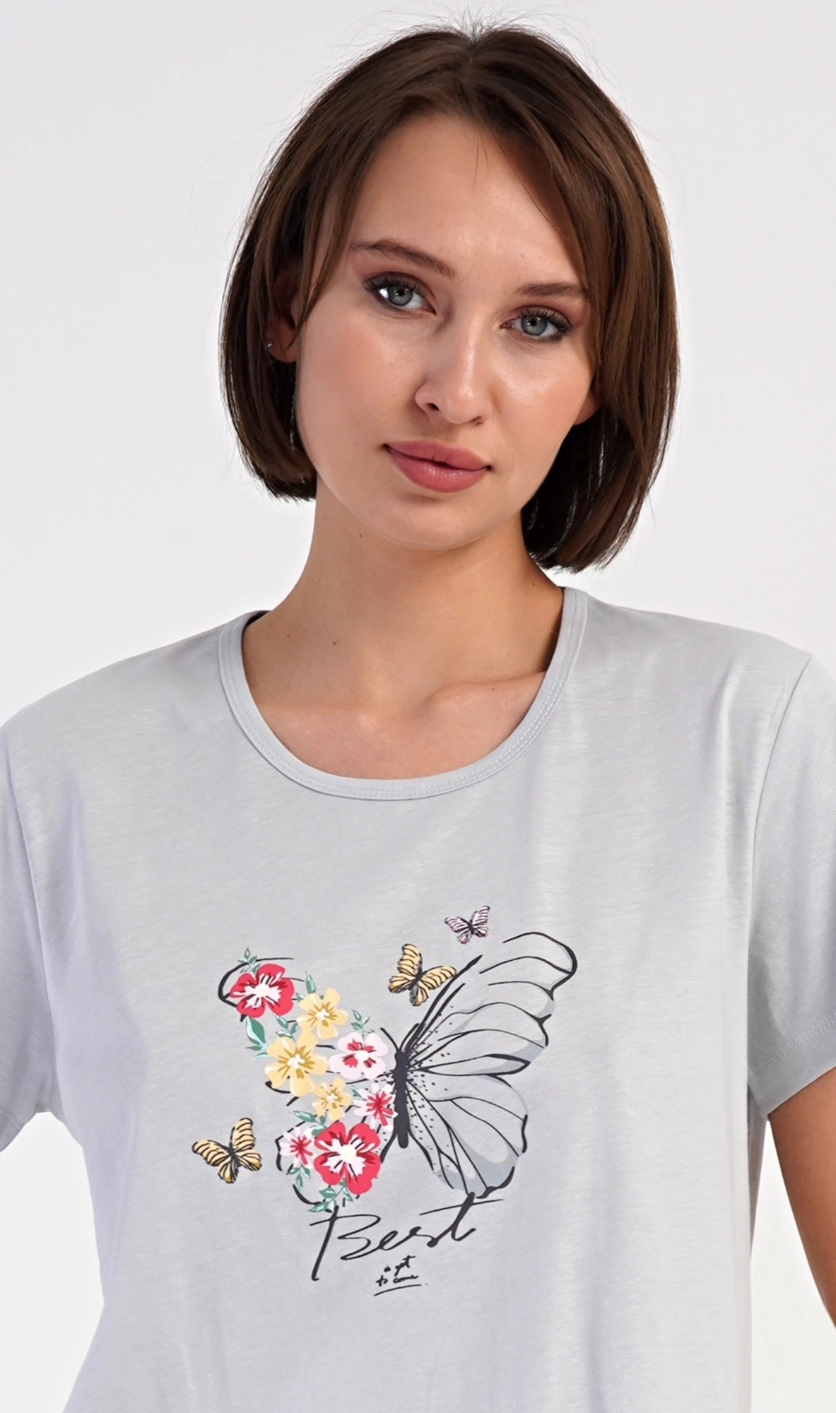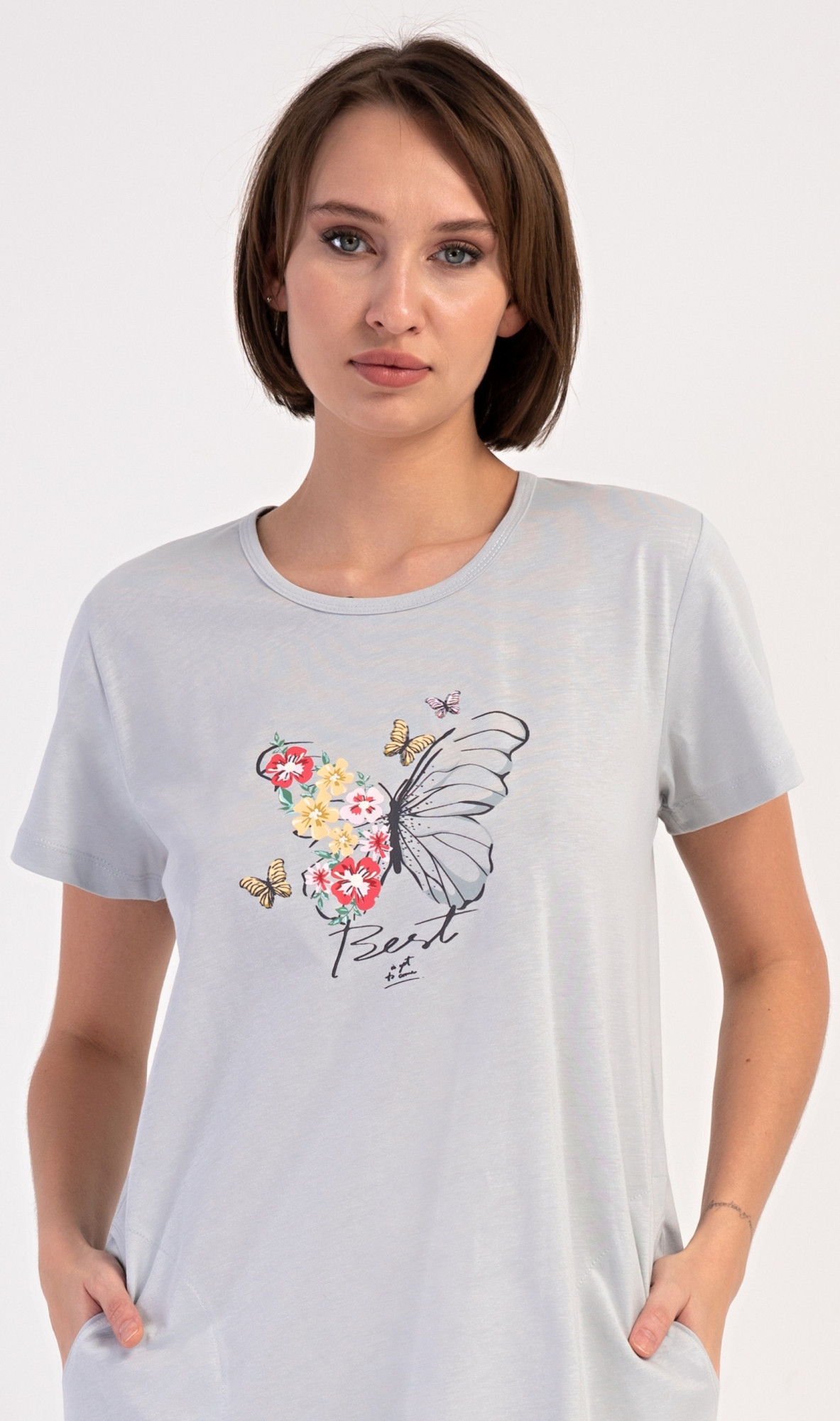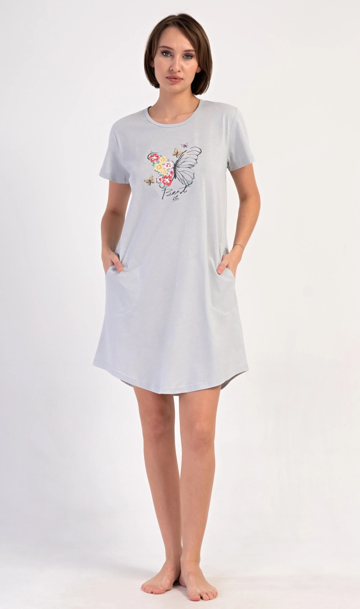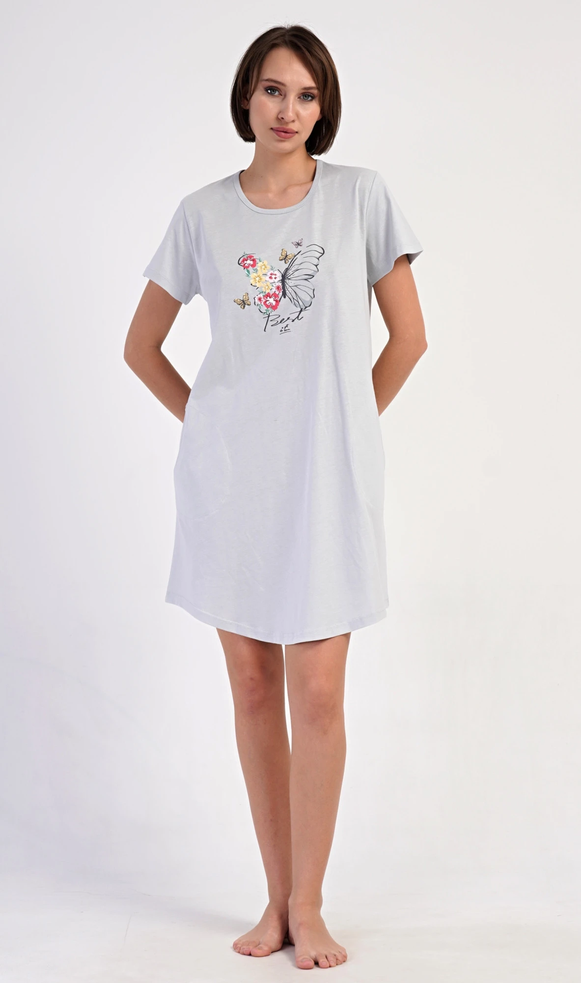 Dámské bavlněné domácí šaty s krátkým rukávem Amelia. Domácí jednobarevné šaty s kulatým výstřihem a kapsami zdobí na hrudi obrázek motýla a květů. Použitý bavlněný materiál je příjemný a poddajný na dotek. Šaty jsou pohodlné, vhodné na spaní i na denní nošení.