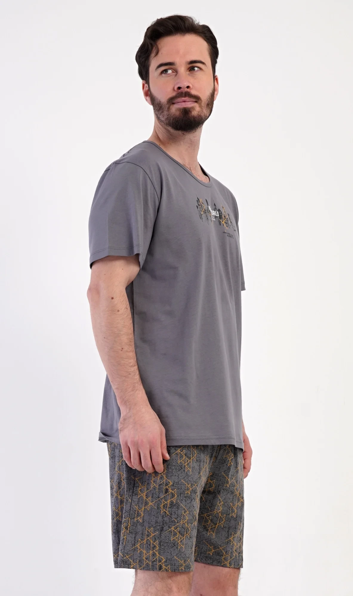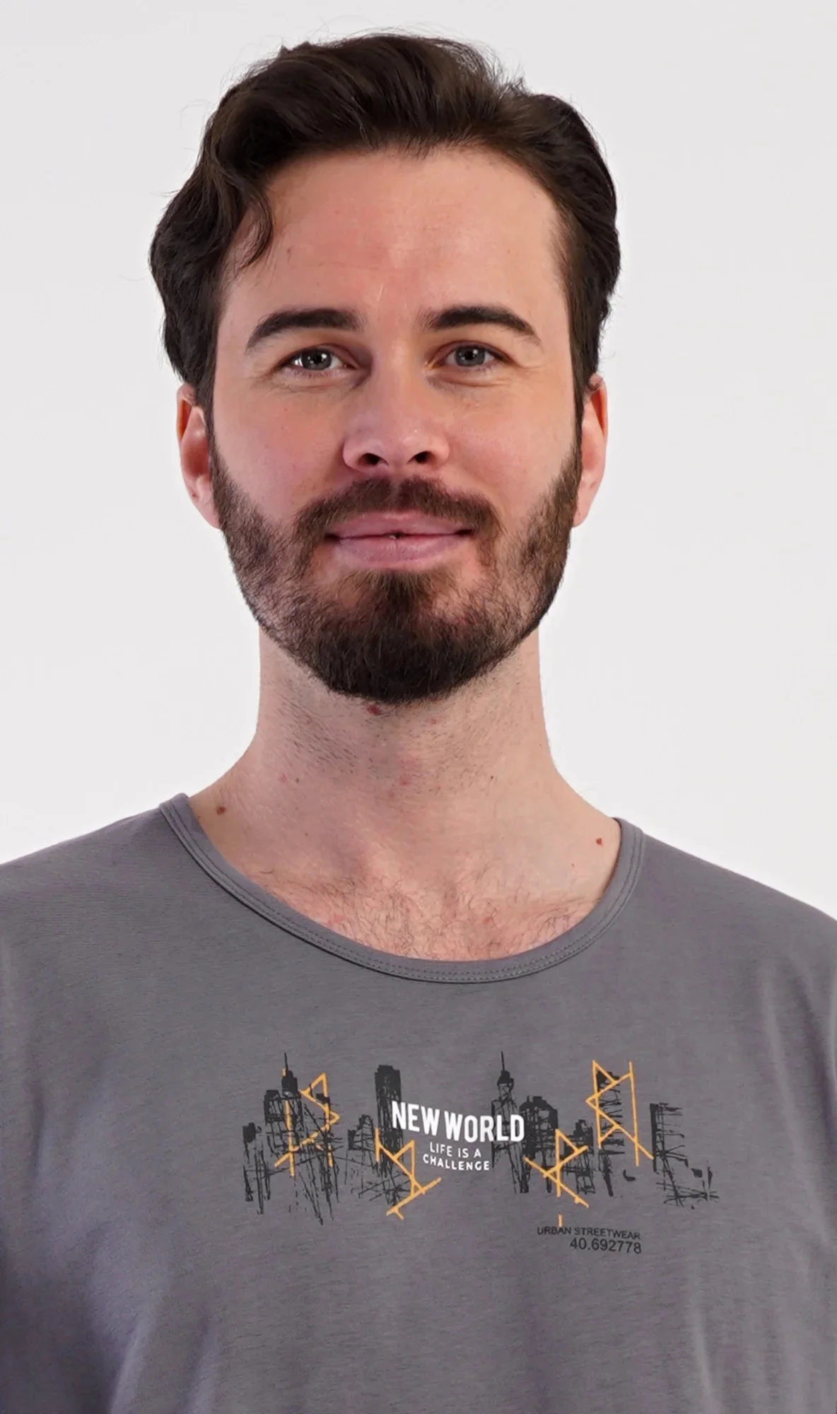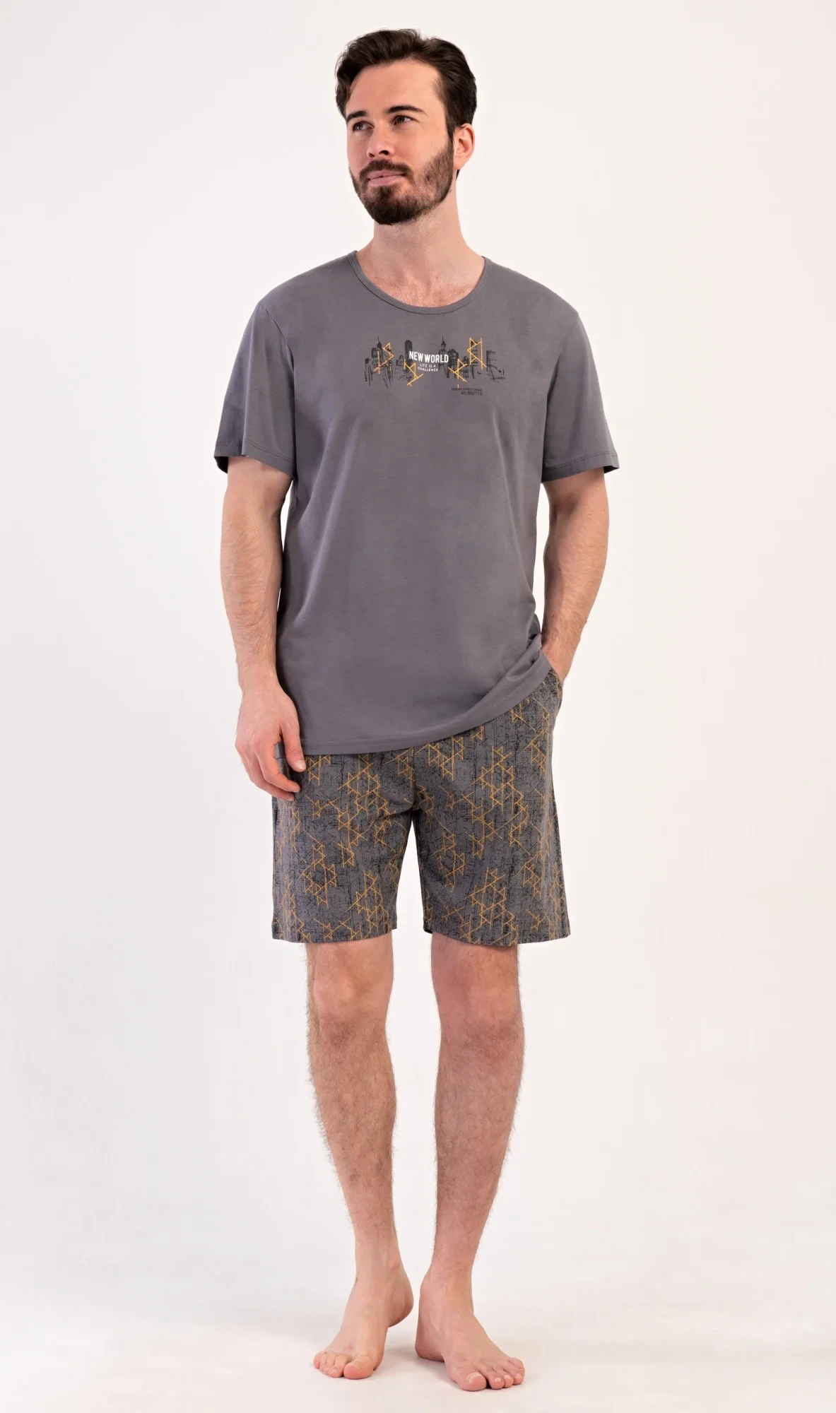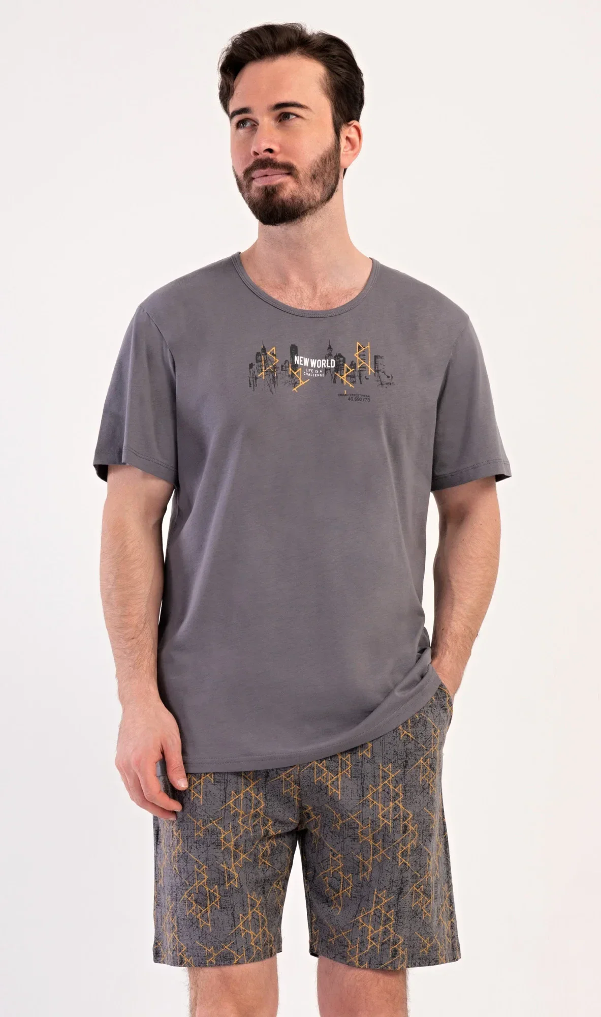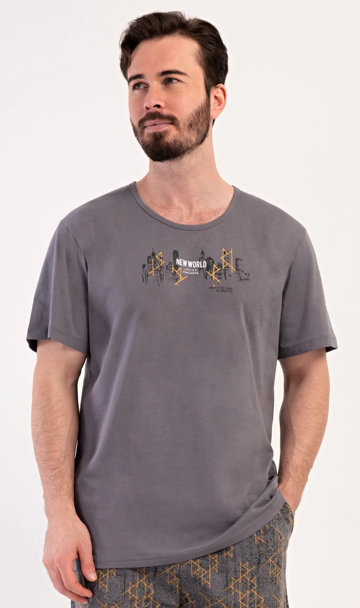 Pánské bavlněné šortkové pyžamo City. Pánské pyžamo se skládá z trička s krátkým rukávem a krátkých šortkových kalhot. Jednobarevné tričko s kulatým výstřihem zdobí na hrudi obázek výškových budov a nápis NEW WORLD. Tričko doplňují šortky, které mají v pase gumu, šňůrku na stažení a praktické kapsy. Použitý materiál s obsahem bavlny 100% je příjemný a poddajný na dotek.